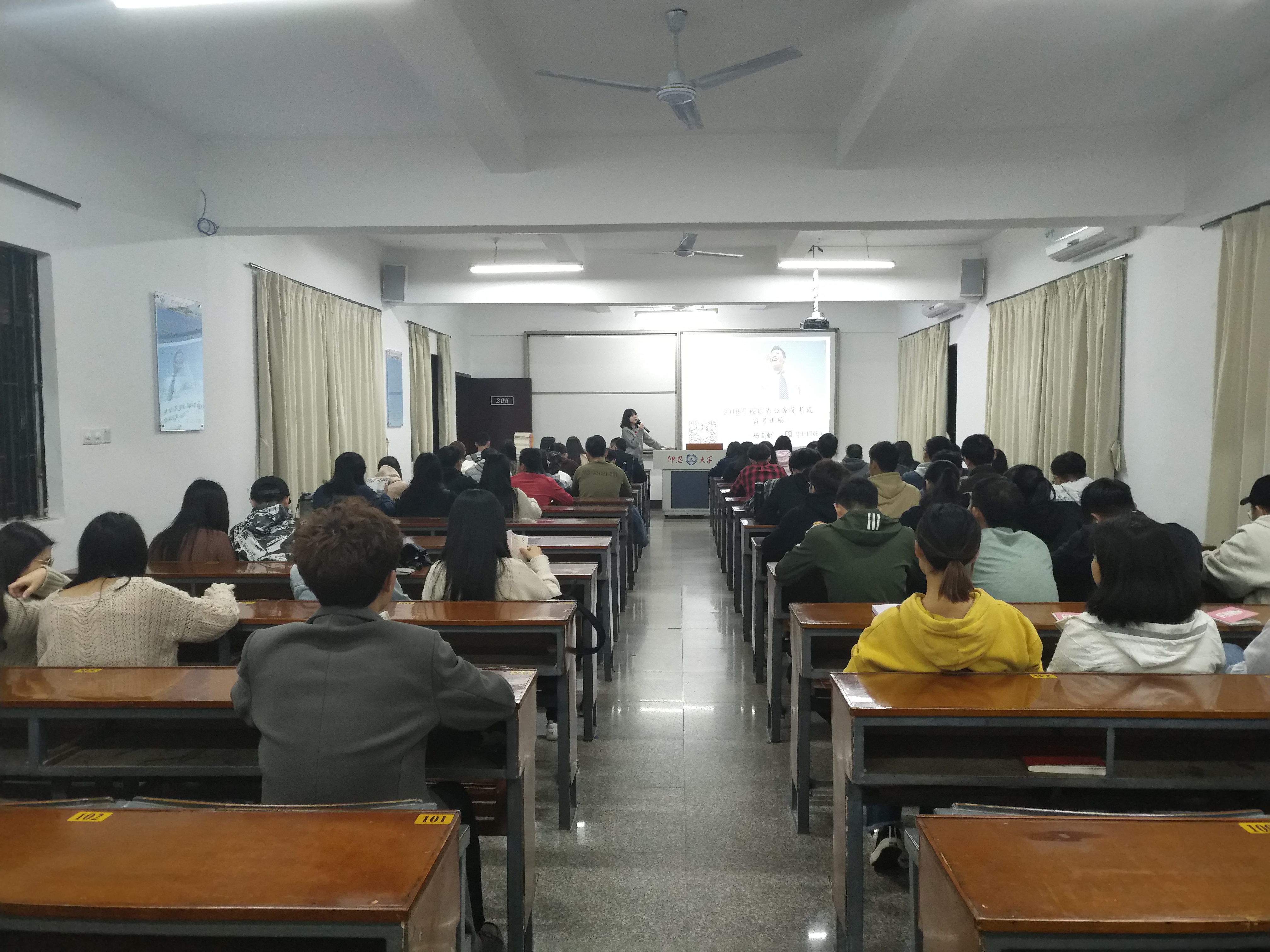 3月20日晚,2018福建省公务员备考讲座于太阳成tyc7111cc官网第一教学区共和楼205开展。华图教育的杨美虾老师为现场50余名有志参加公务员考试的同学们解读了2018年福建省公务员考试公并对同学们从岗位选择、考试题型、如何备考等问题的提问进行了答疑。