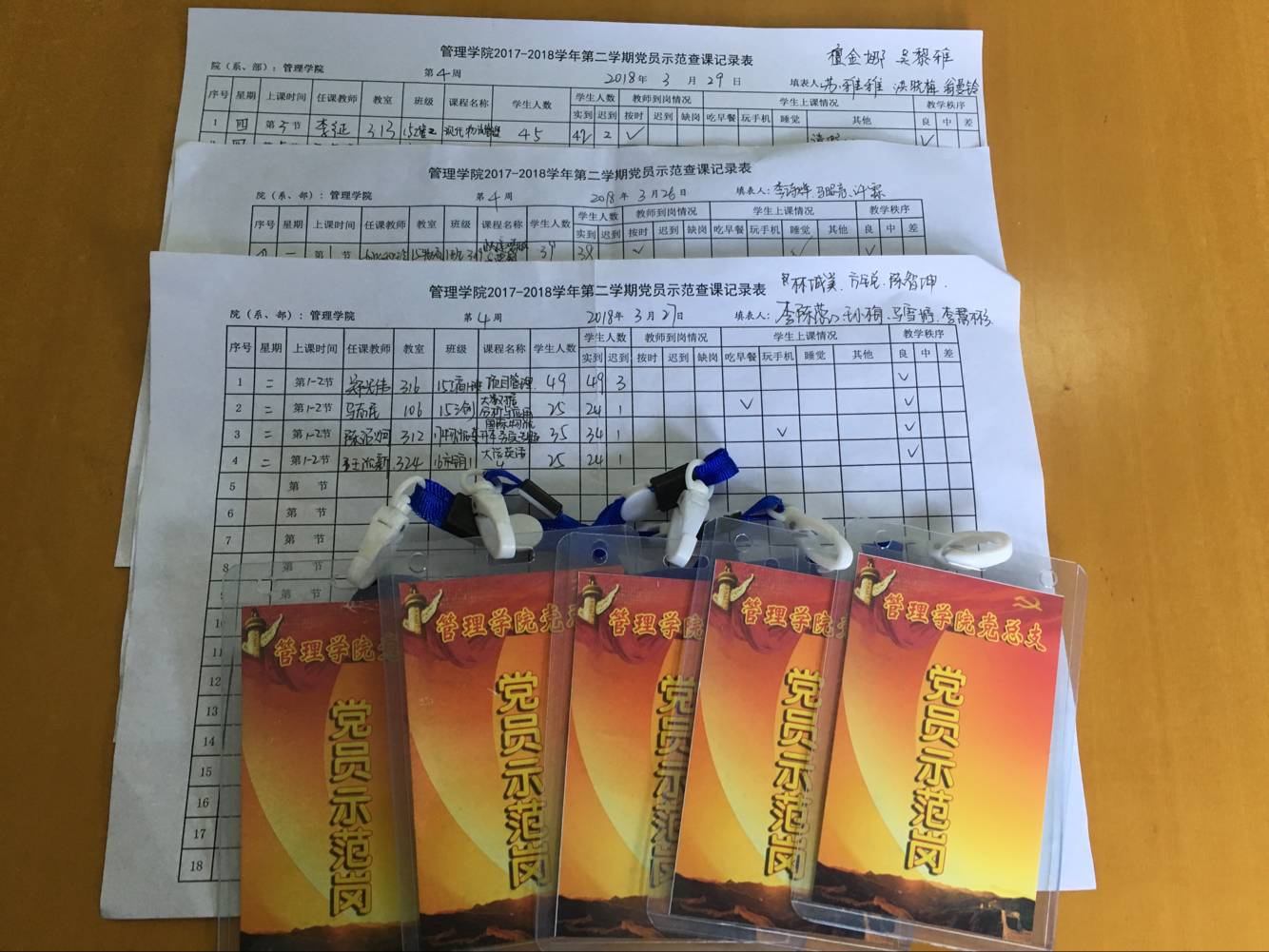 我党总支积极响应校党委“六创争先”的号召,不断摸索和创新学生党建工作。据悉,“党员示范查课”将持续开展一个学期,此次活动旨在“党建创强”,通过实行“挂牌上岗”制度,强化学生党员的党员意识、责任意识、争优意识,以榜样树学风、以活动促学风,激励党员每天都有新的精神状态、每天都有新的进步,树立共产党员的良好形象,助力太阳成tyc7111cc官网建设优良学风。(杜心田/文 太阳成tyc7111cc官网党总支/图)