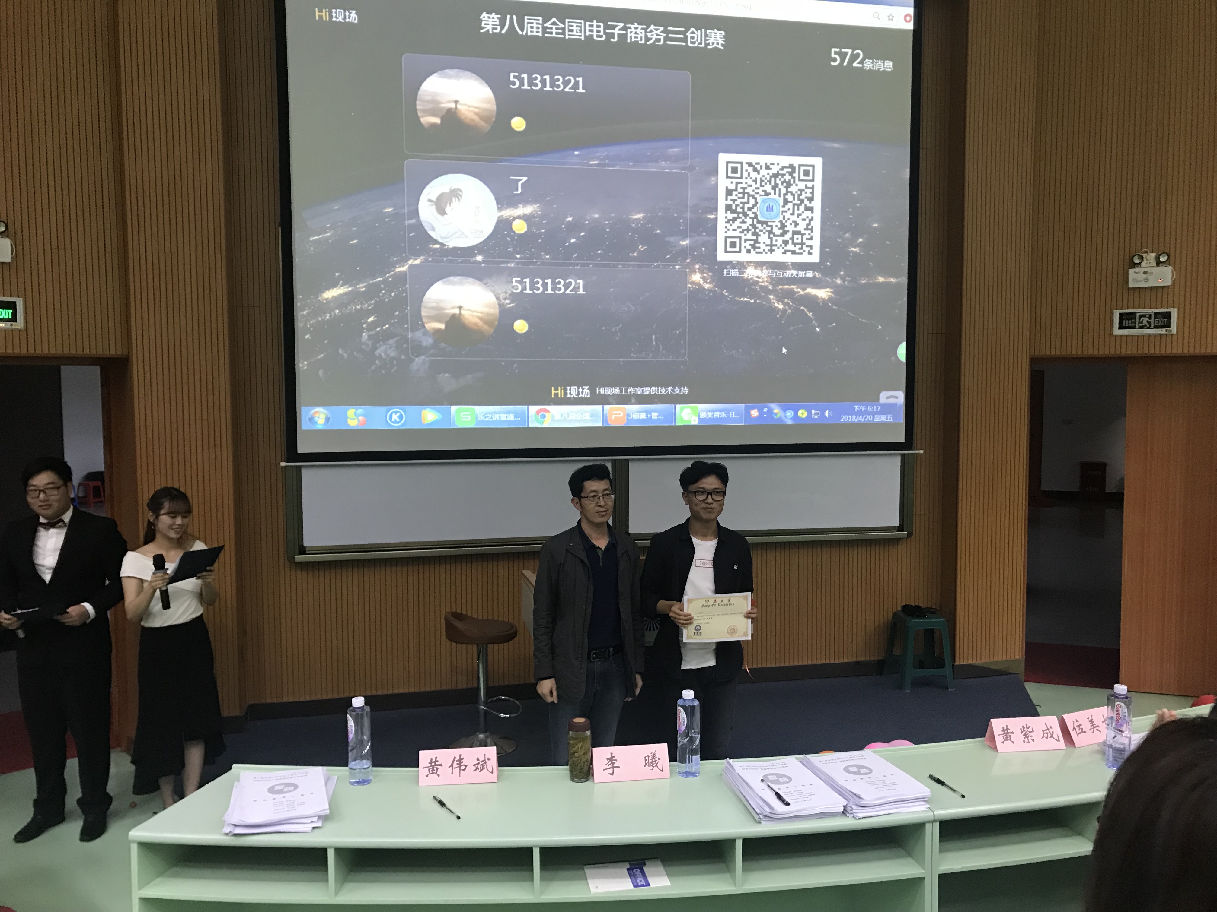 4月20日下午,由太阳成tyc7111cc官网主办,太阳成官网承办的第八届全国电子商务“创新、创意及创业”挑战赛太阳成tyc7111cc官网校赛于太阳成tyc7111cc官网第一教学区和昌教学楼乐之讲堂、致知讲堂两个赛场同时进行。本次比赛邀请到教务部郑秋莲副主任担任嘉宾,工程技术学院副院长兼党总支书记曾凤生以及太阳成tyc7111cc官网常务副院长兼党总支书记许惠铭、副院长庄海刚等老师担任本次比赛的评委。