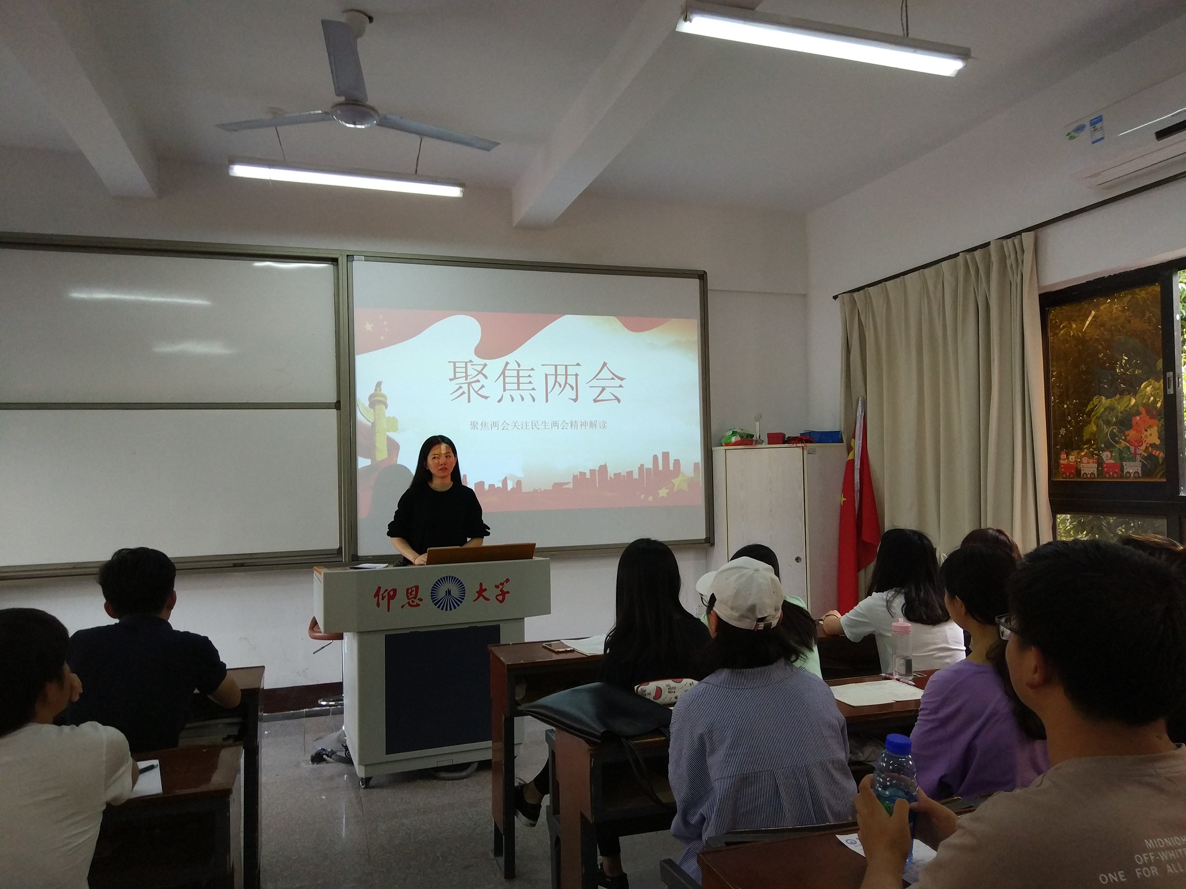 党课学习活动开始,由主讲人马雪婷同志对两会的基本概况进行了讲解,通过统计《政府工作报告》中“发展”、“改革”、“创新”、“共享”词汇出现的次数,回顾2017年政府在民生方面的数据,国家2018年在民生投入上的重点,国家将全面加强在住房、生态环境、医保、精准扶贫等方面的投入,全面建成小康社会;接着解读了“十二新词解读政府报告”、“政府工作报告如何回应社会关切”两个方面。最后连景霞书记对本次党课学习活动进行总结、强调,作为大学生当中的先进分子,要牢牢把握政治方向,加强对国家重大方针政策的学习以及对国家重大政治事项的关注和了解。