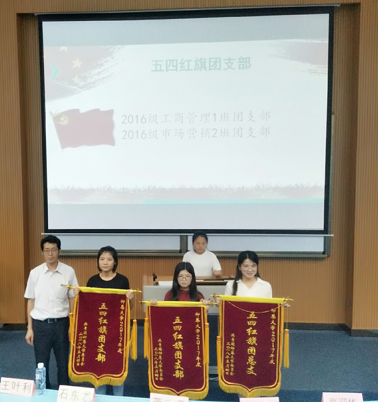 为总结表彰一学年以来太阳成官网共青团工作所取得的成绩,5月17日晚,在太阳成tyc7111cc官网第一教学区和昌楼求是讲堂举行“太阳成tyc7111cc官网五四表彰大会暨2018年暑期实践动员大会”。太阳成tyc7111cc官网党总支书记兼常务副院长许惠铭,工商管理系蒋志丹老师等各系老师、辅导员及太阳成tyc7111cc官网17级学生参加此次大会。