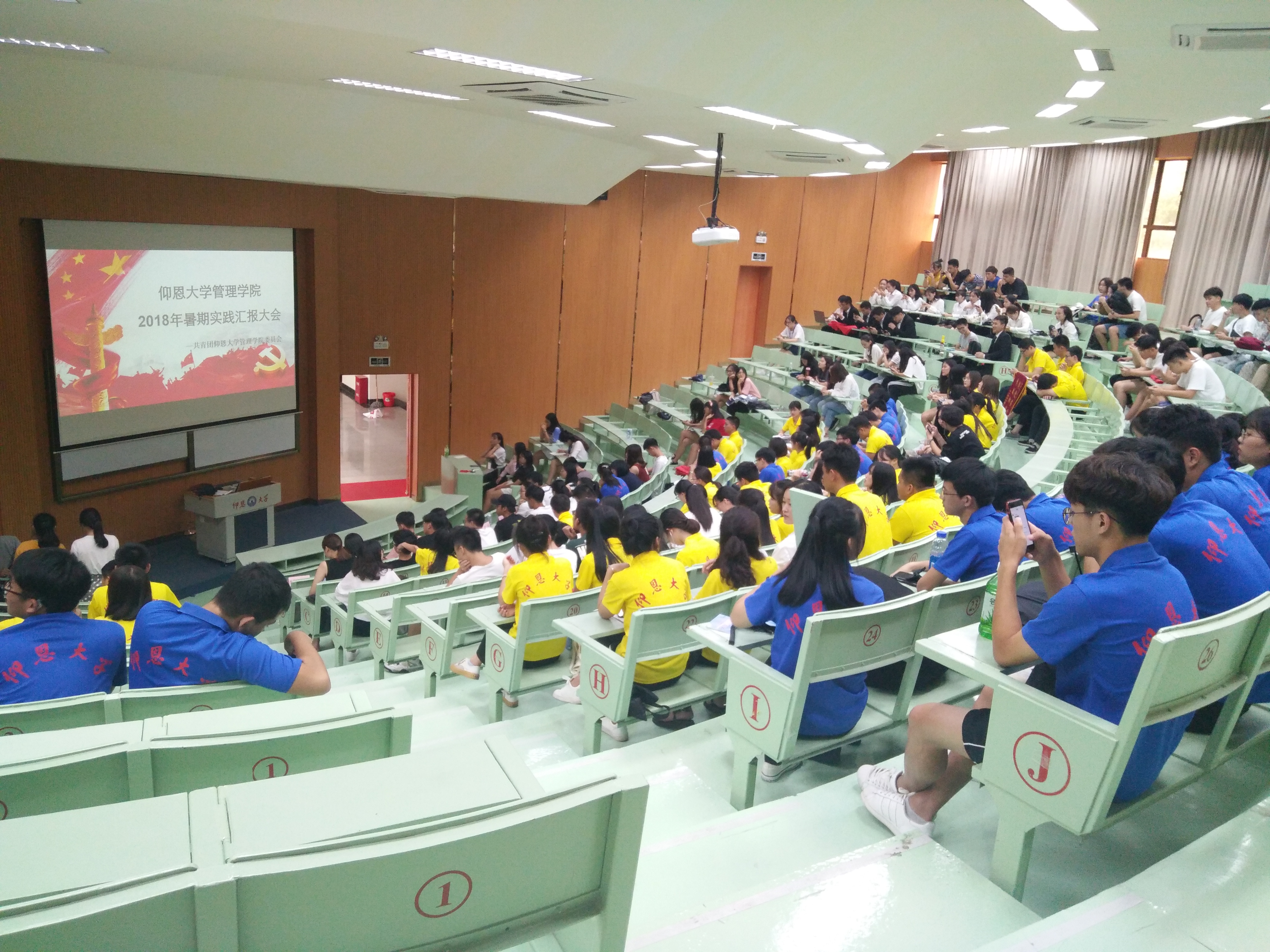 9月12日下午,太阳成官网2018年暑期实践汇报评选大会在第一教学区和昌教学楼乐之讲堂顺利举行。太阳成tyc7111cc官网党总支书记兼常务副院长许惠铭、工商管理系教师陈玉珠、市场营销系教师张迎华及全体辅导员、院团委副书记苏雅雅、院学生会主席周家为以及各实践队部分学生代表参加大会。