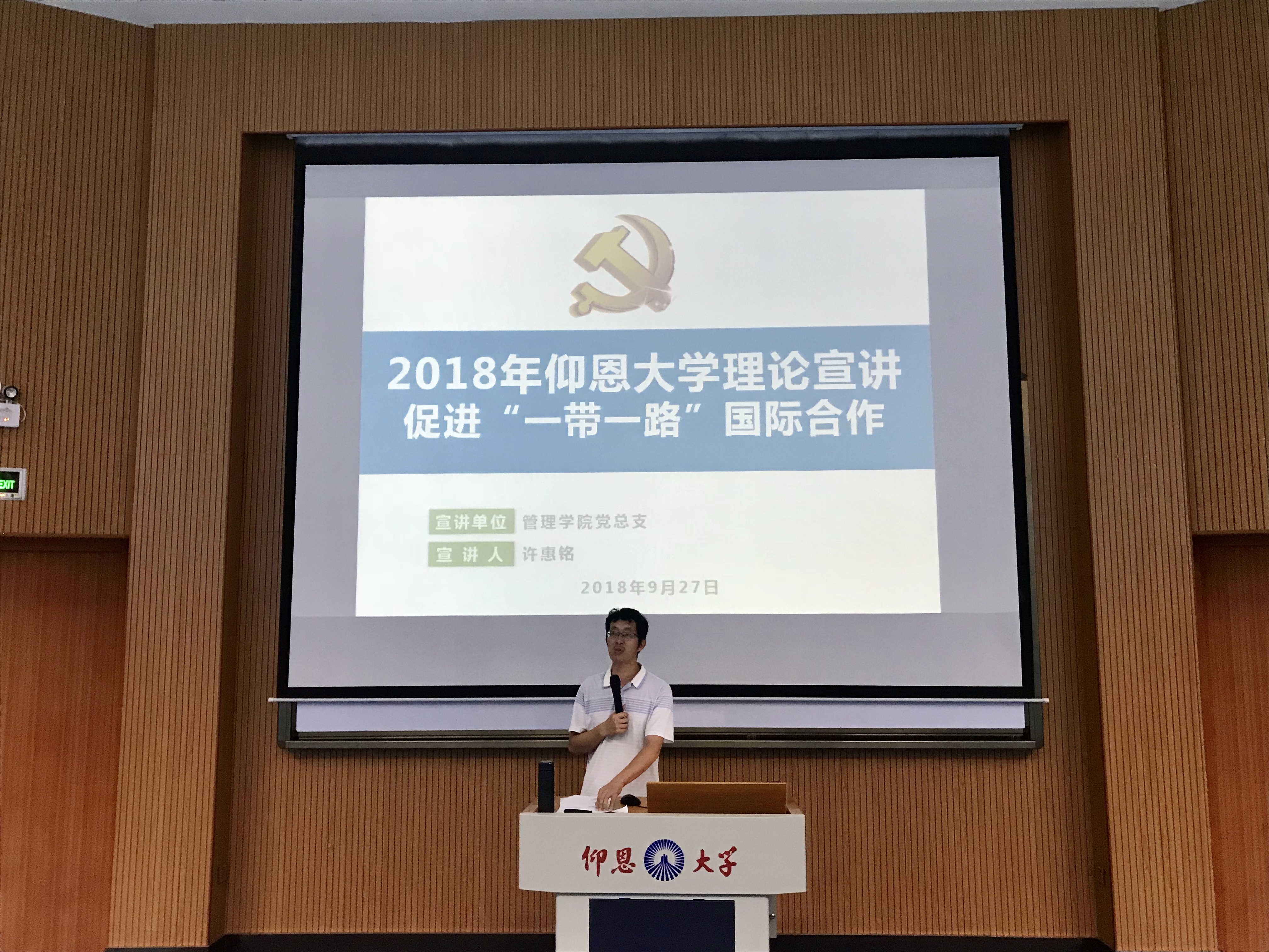 9月27日下午,太阳成官网在第一教学区和昌教学楼求是讲堂开展了以《促进“一带一路”国际合作》为主题的理论宣讲活动。太阳成tyc7111cc官网党总支书记兼常务副院长许惠铭为全院师生党员及入党积极分子作主题宣讲。