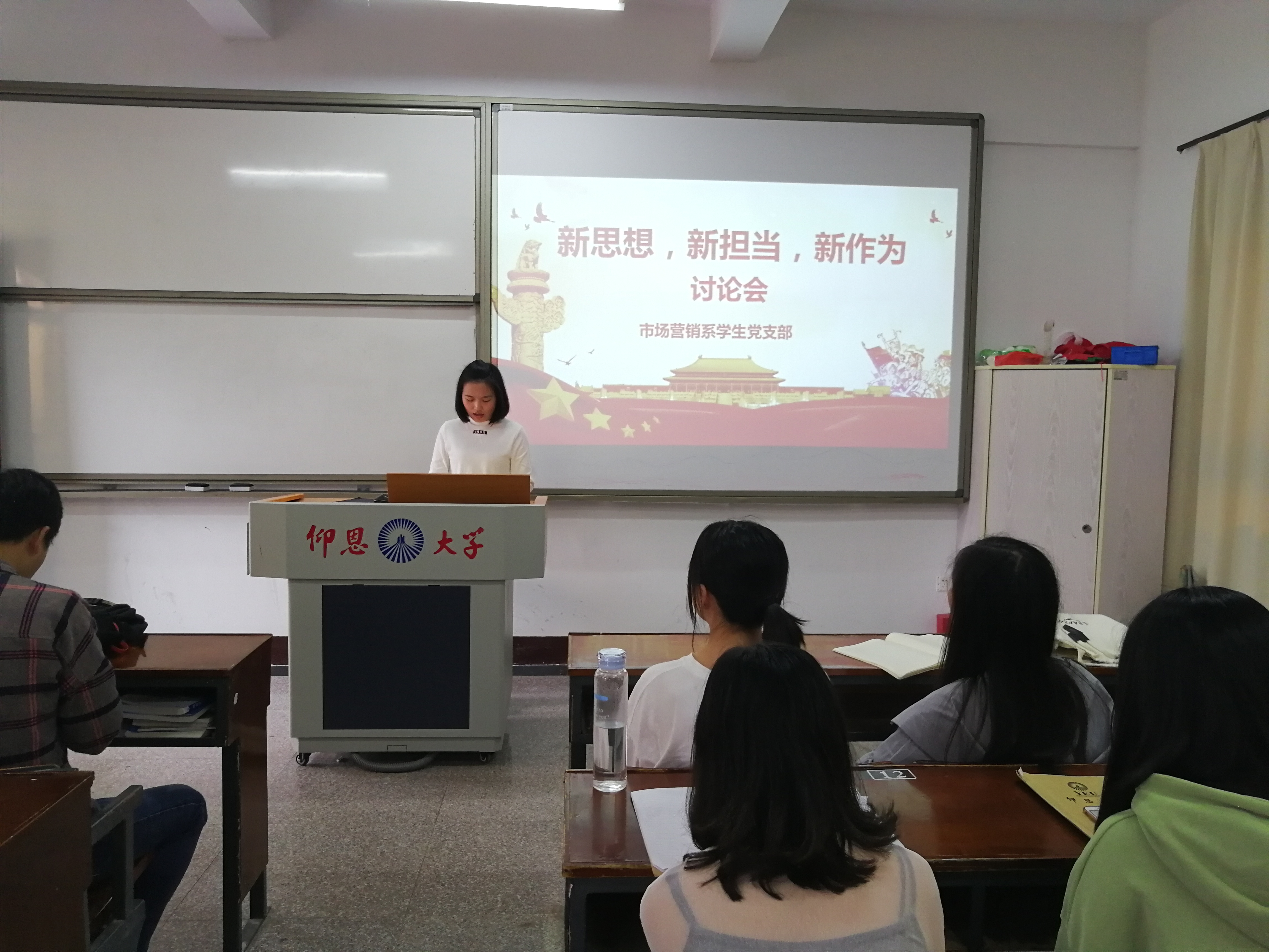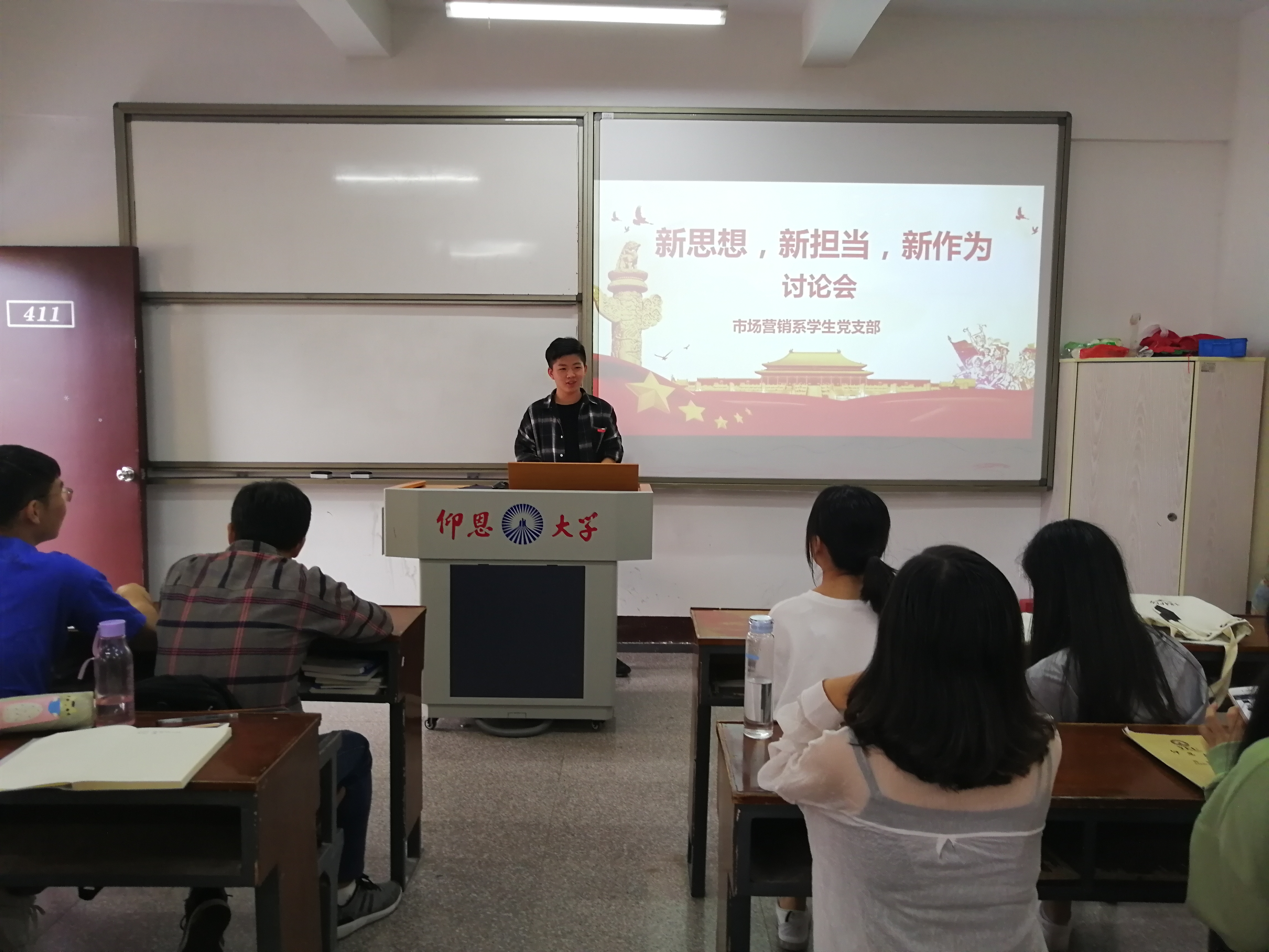 10月18日下午,市场营销系学生党支部在共和楼411召开关于“新思想、新担当、新作为”的专题讨论会。参加本次讨论会的有市场营销系学生党支部书记连景霞以及支部全体党员,讨论会由连景霞同志主持。