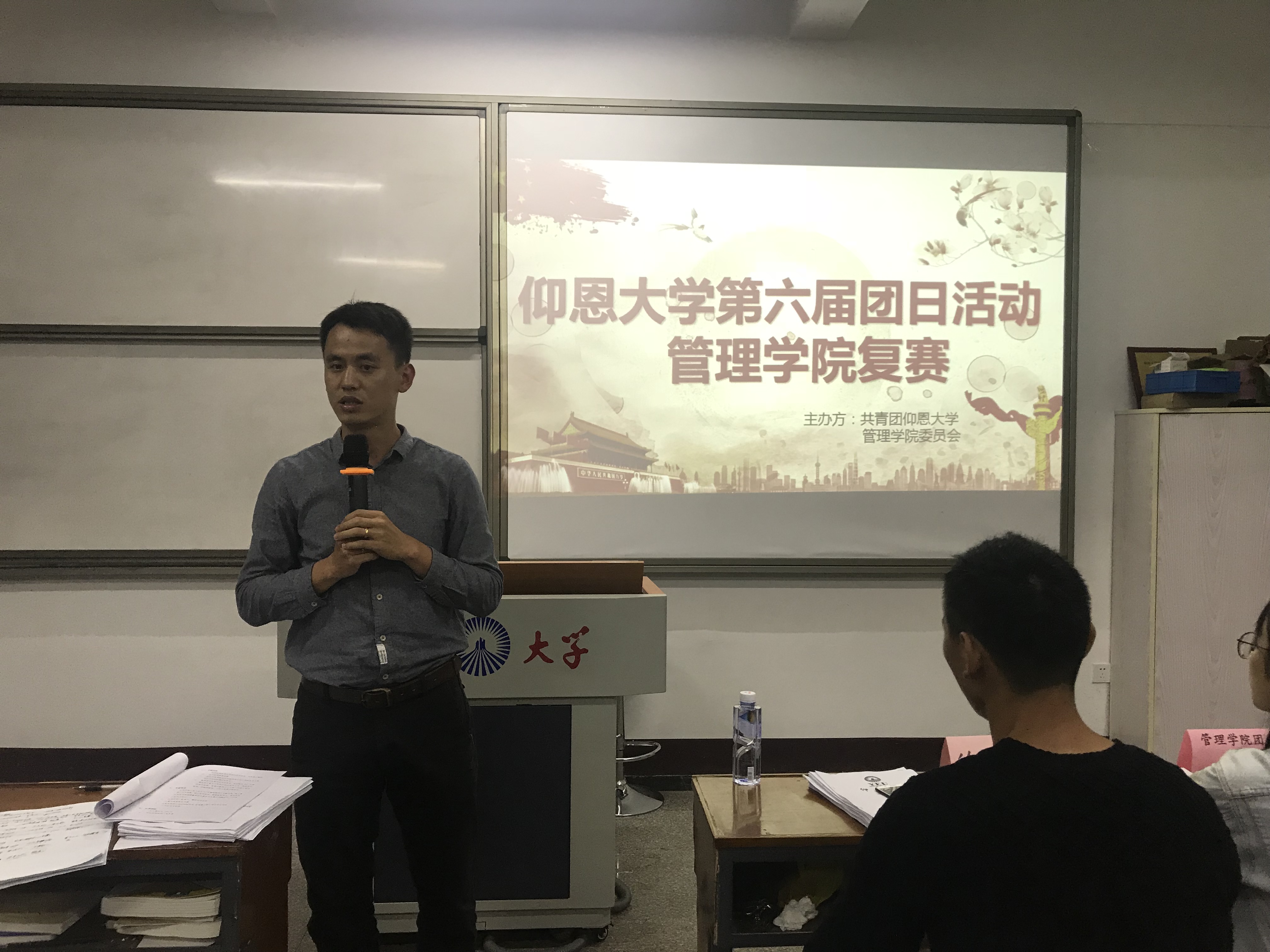 为了加强基层团建,进一步增强团支部活力,11月21日晚,太阳成官网团委于第一教学区共和楼313举办太阳成tyc7111cc官网第六届团日活动大赛太阳成tyc7111cc官网复赛。此次团日活动的主题为“不忘初心跟党走·青春建功新时代”。太阳成官网团委书记杜结实、工商管理系代理团总支书记李育瑜、公共管理系团总支书记徐鸿飞、太阳成官网团委副书记苏雅雅、陈辉以及物流管理系团总支副书记胡聪艺应邀担任评委。