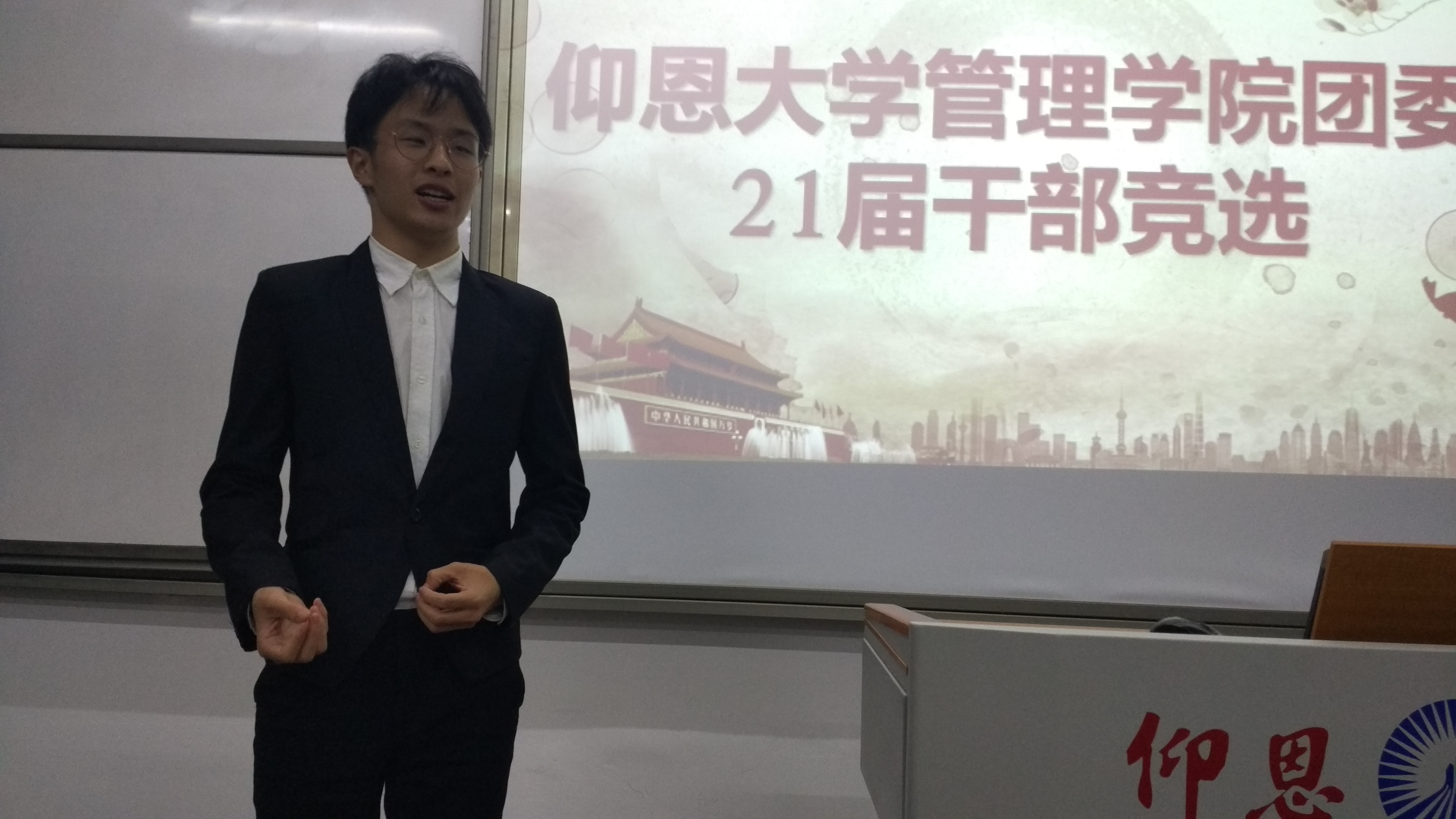 11月29日晚,太阳成官网团委于第一教学区共和楼313举行第二十一届干部换届竞选。此次换届竞选的评委有太阳成官网团委书记杜结实,太阳成官网团委第二十届学生副书记苏雅雅和陈辉,太阳成官网团委第二十一届代理学生副书记傅欣怡和郑玉琨以及太阳成官网团委各部门的部长。