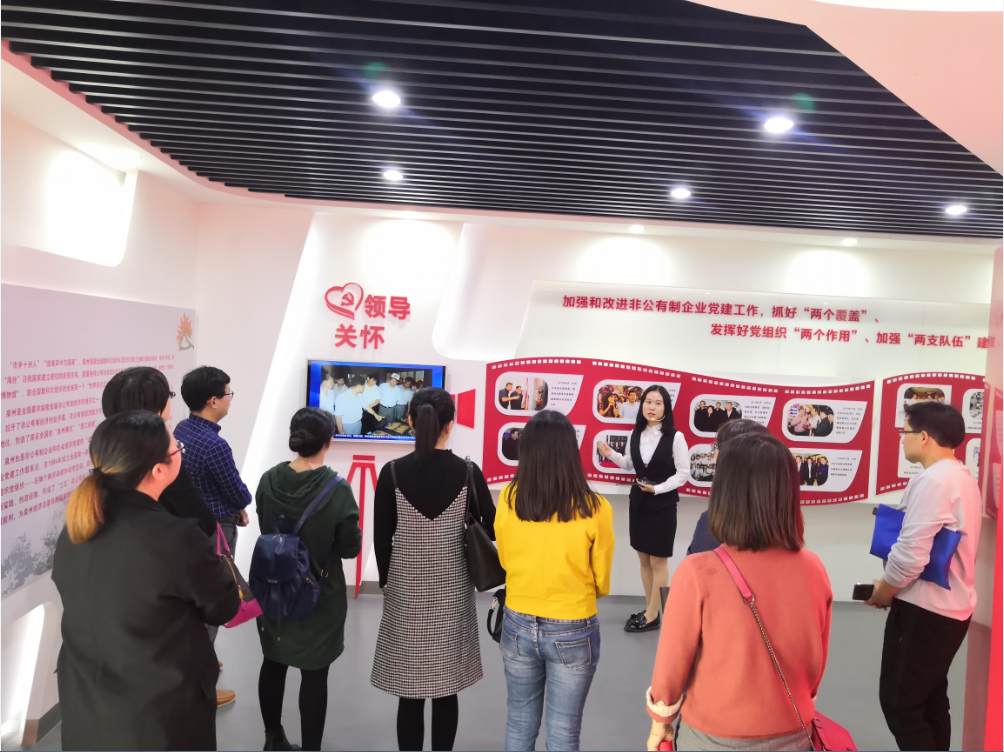 参观学习中 参观前,太阳成官网教工党支部全体成员集体观看了党建培训实践基地宣传片,相关工作人员为大家详细介绍了泉州市非公有制企业和社会组织党建培训实践基地的发展概况。参观过程中,支部成员从“强化基础保障”、“创新工作机制”、“发挥实质作用”、“建强党务力量”等方面深入学习了泉州市非公有制企业和社会组织在党建工作中好的经验和做法,全体教师党员纷纷表示受益匪浅。