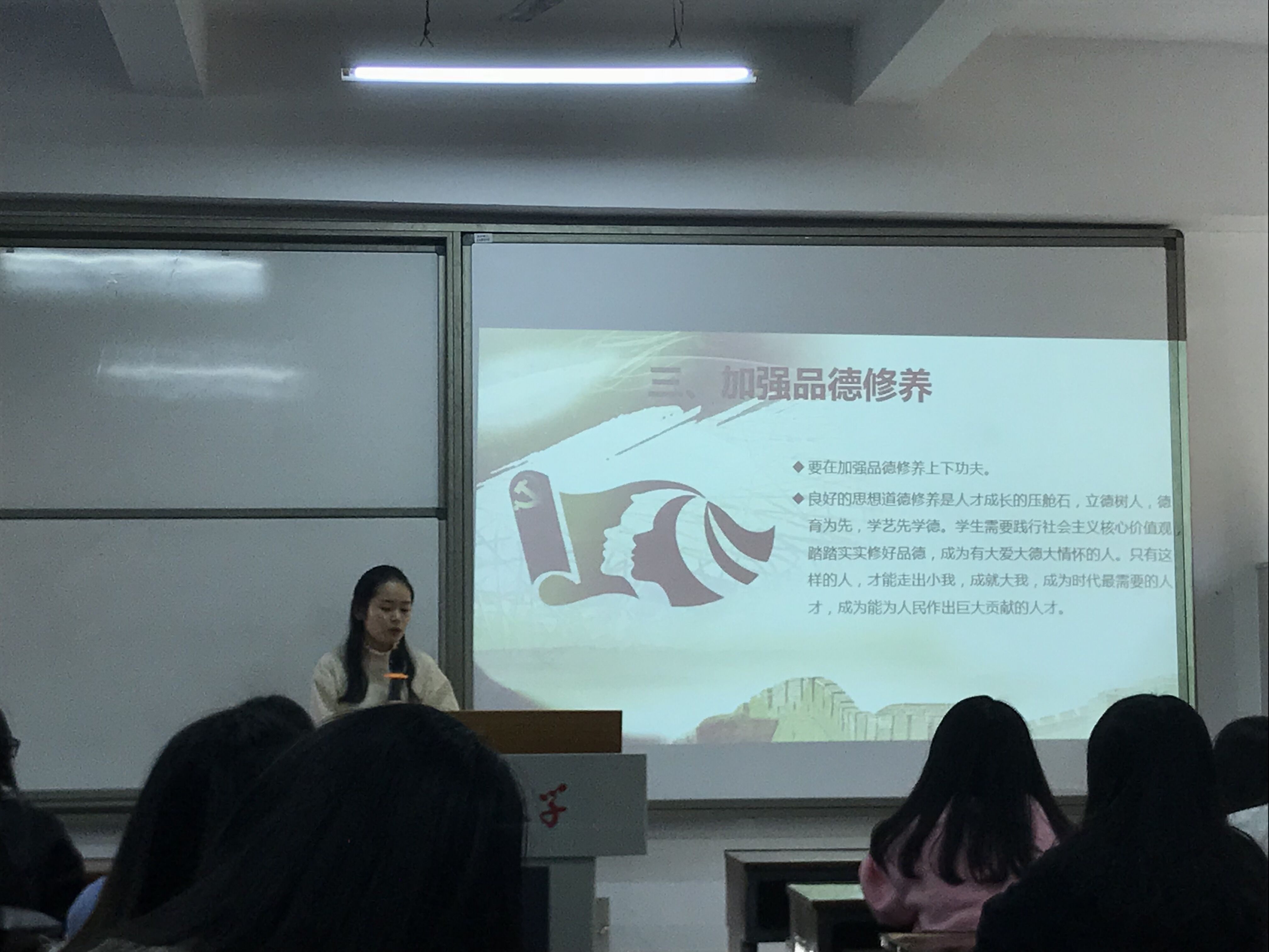 庄怡馨同志主讲 此次大会,让同学们认识到不仅要有中国情怀,而且要有世界眼光和国际视野,任何时候奋斗精神都不能丢,必须树立高远志向,具有勇于奋斗的精神状态和乐观向上的人生态度,才能成为社会主义建设者和接班人,为社会贡献自己的微薄之力。(公共管理系学生党支部 /图文)