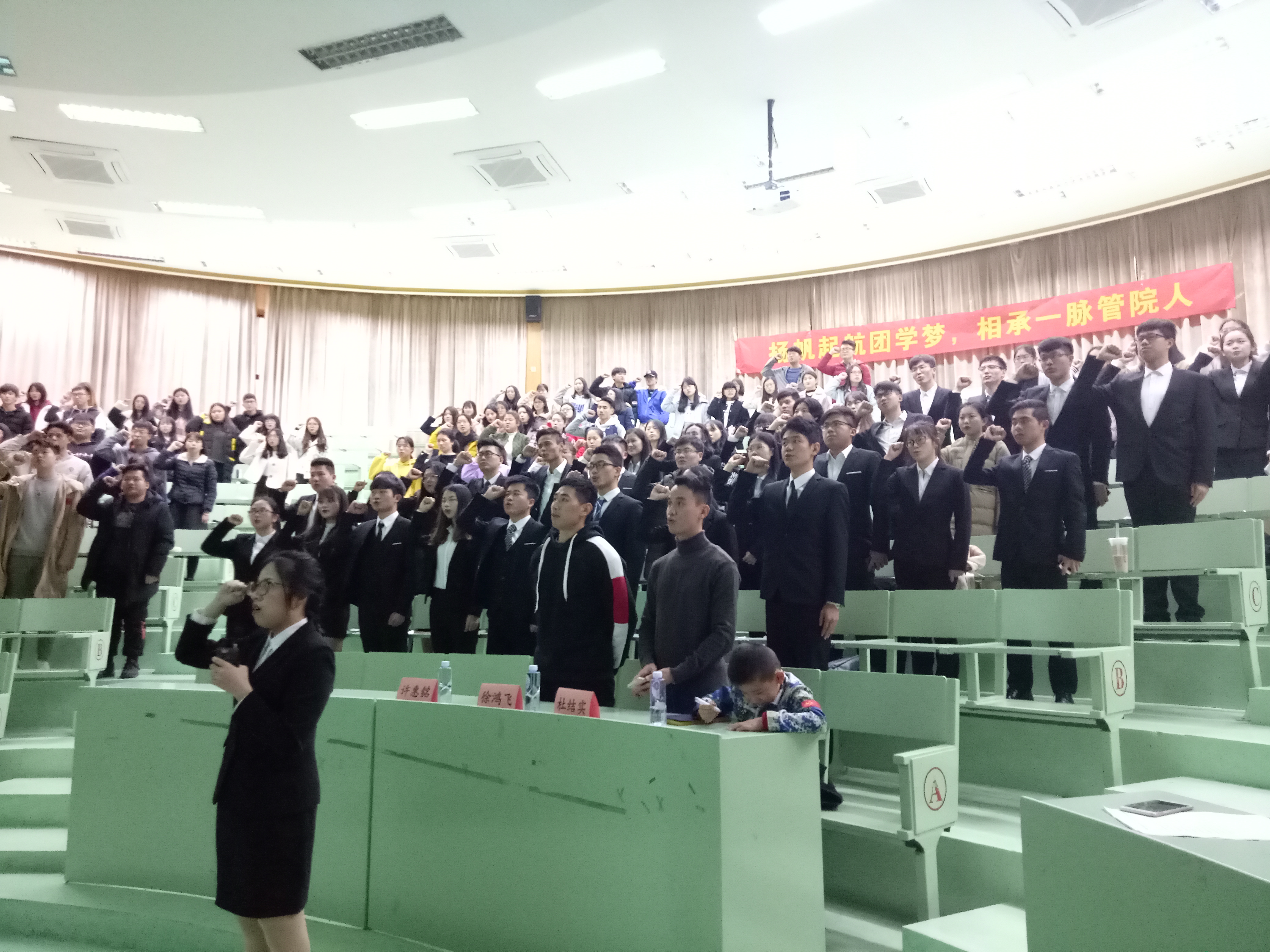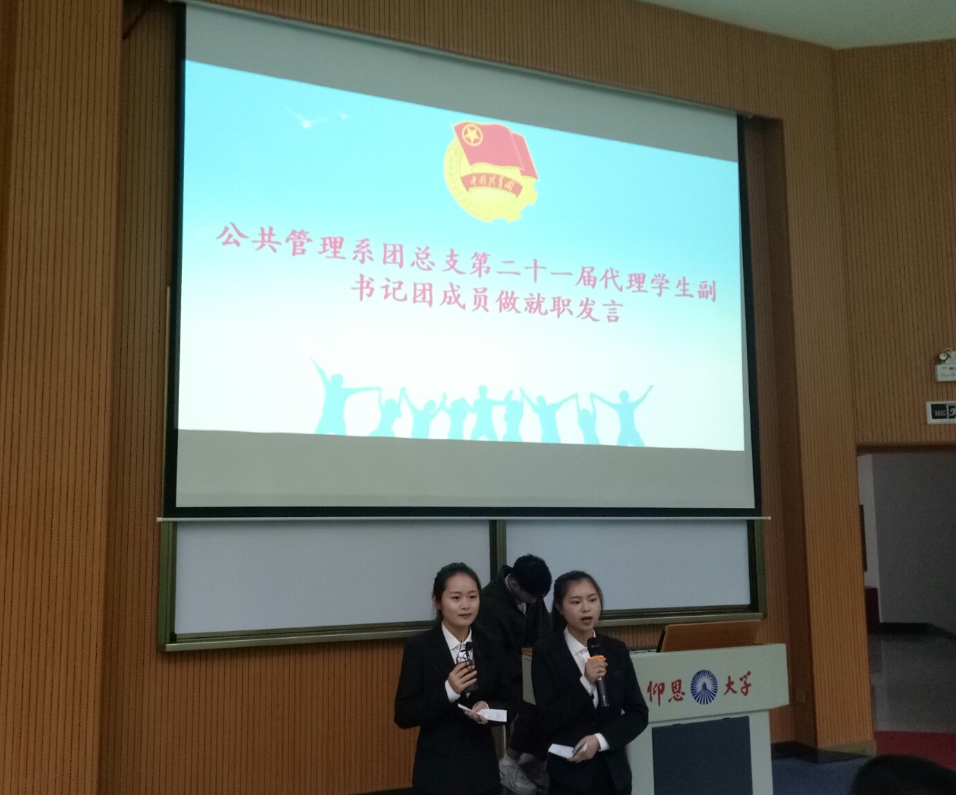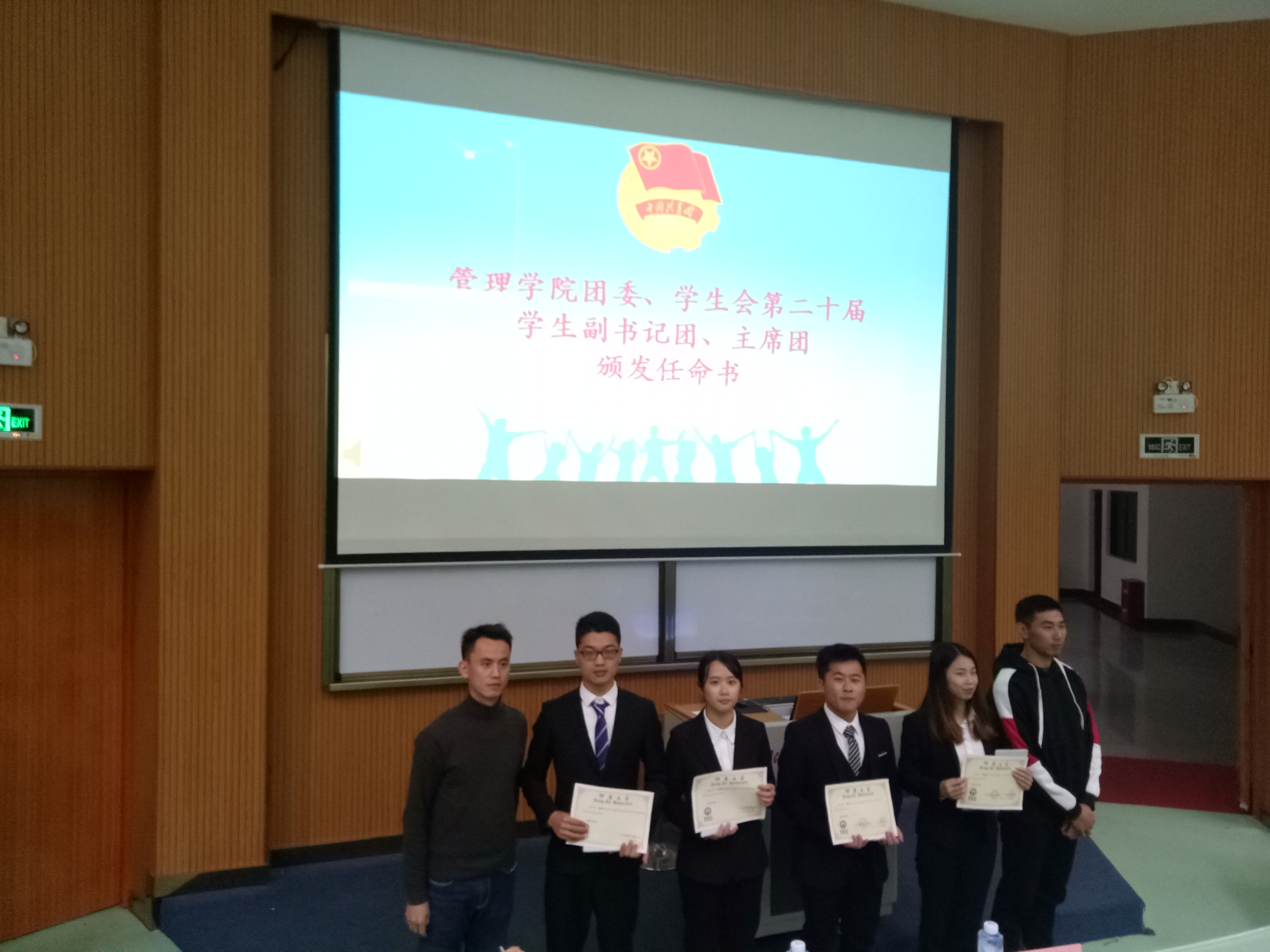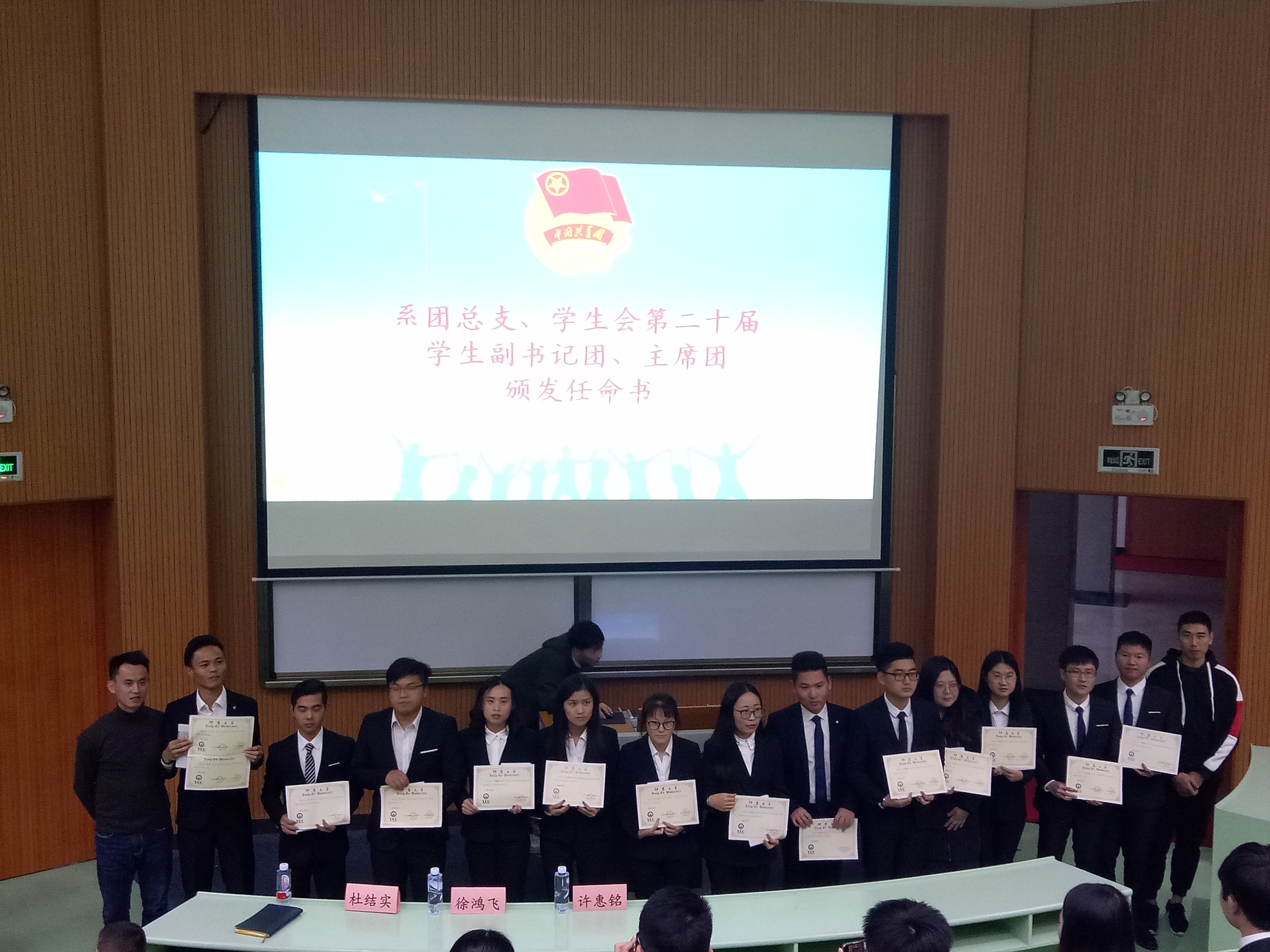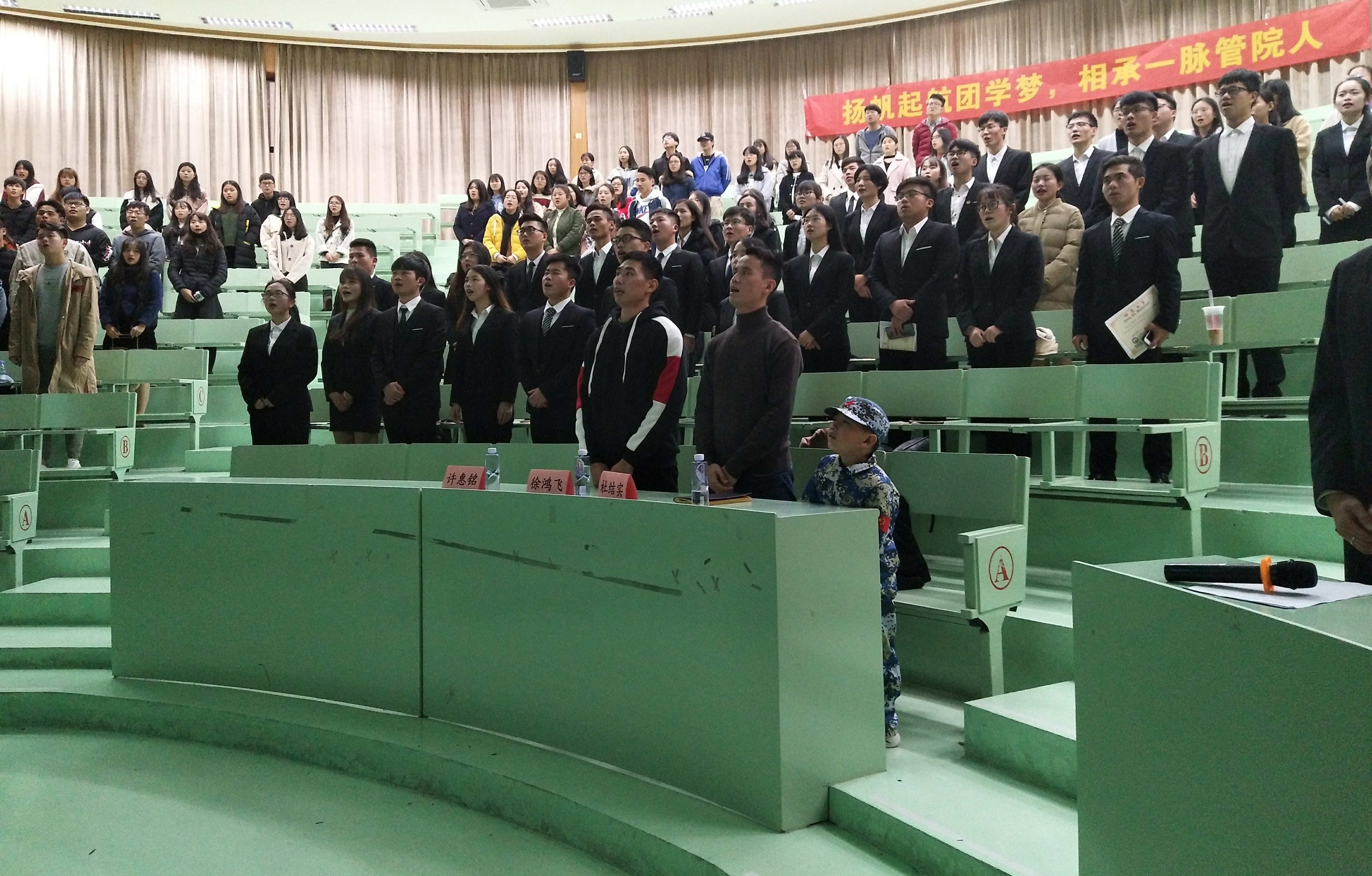 1月3日下午,太阳成官网团学干部换届交接大会在第一教学区和昌教学楼乐之讲堂举行。太阳成官网团委书记杜结实、公共管理系团总支书记徐鸿飞到场参加。