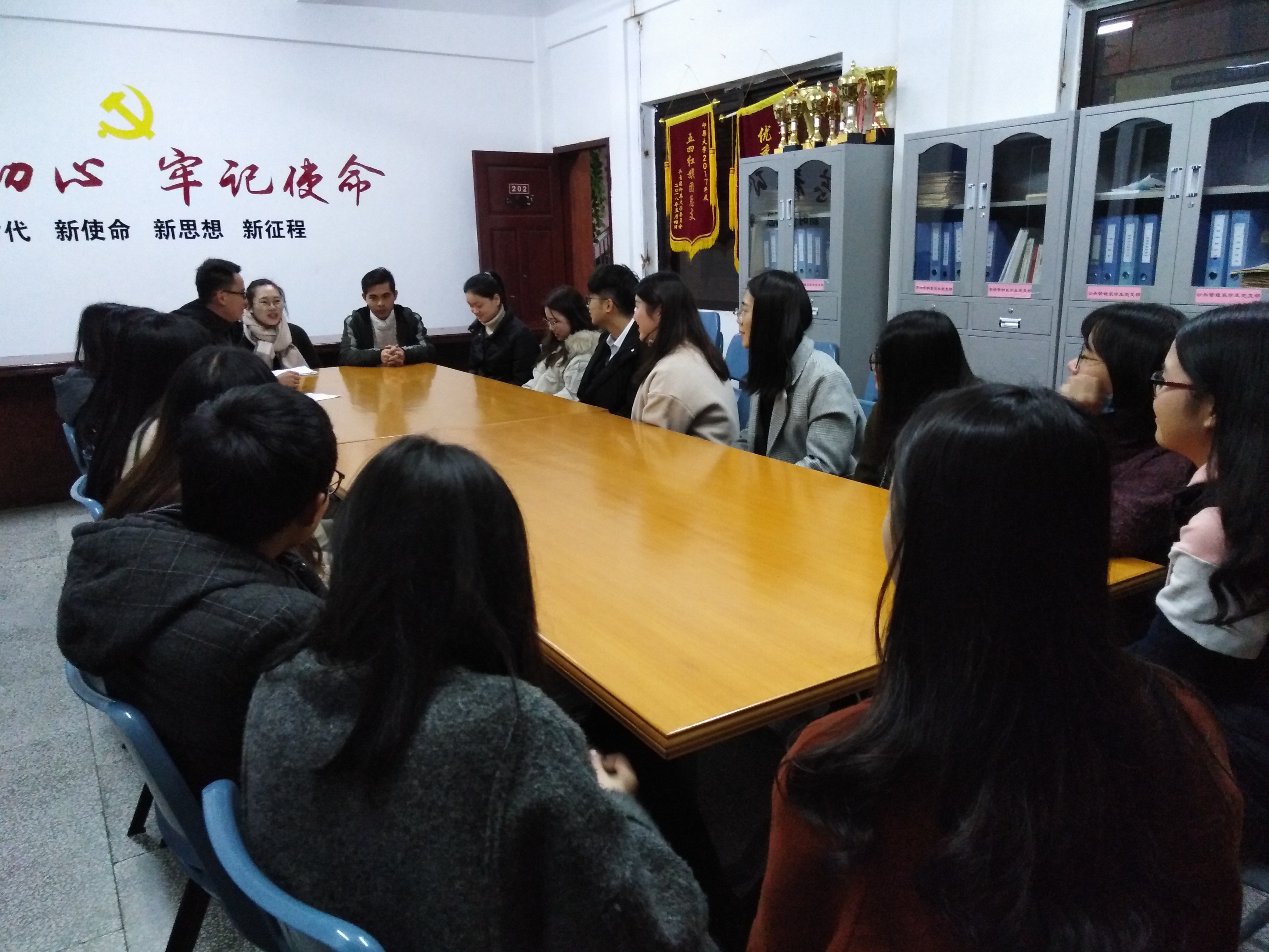 1月3日,工商管理系学生党支部于曼谷楼202召开组织生活会进行2018年度党员民主评议。此次会议分为三个部分:一、党员自评、互评,二、民主测评,三、会议总结。