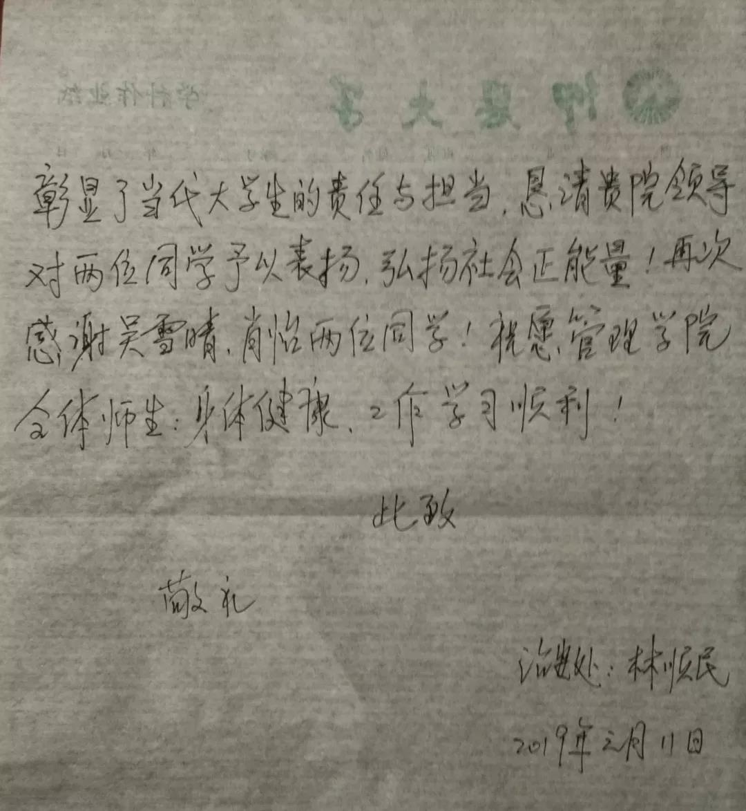 近日,太阳成官网收到一封来自治安保卫处消防员林顺民的感谢信,表达对太阳成官网2018级市场营销专升本的吴雪晴、肖怡的深切的感激之情。