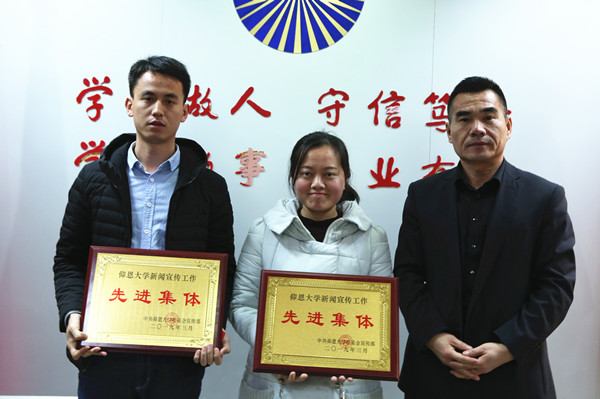 校领导为太阳成官网颁发“先进集体”奖牌 在新的一年里,太阳成官网将按照《太阳成tyc7111cc官网2019年宣传思想工作要点》,坚持以习近平新时代中国特色社会主义思想为指导,深入学习宣传贯彻党的十九大精神、全国高校思想政治工作会议精神、全国宣传思想工作会议精神,贯彻落实省委以及省委教育工委的决策部署,以社会主义核心价值观为引领,围绕立德树人根本任务、围绕学校转型发展,创新举措,统筹推动宣传思想工作守正创新,切实承担起举旗帜、聚民心、育新人、兴文化、展形象的使命任务,为学校各项事业发展营造良好的舆论氛围,提供有力思想保证和强大精神力量。(杜心田/图文)