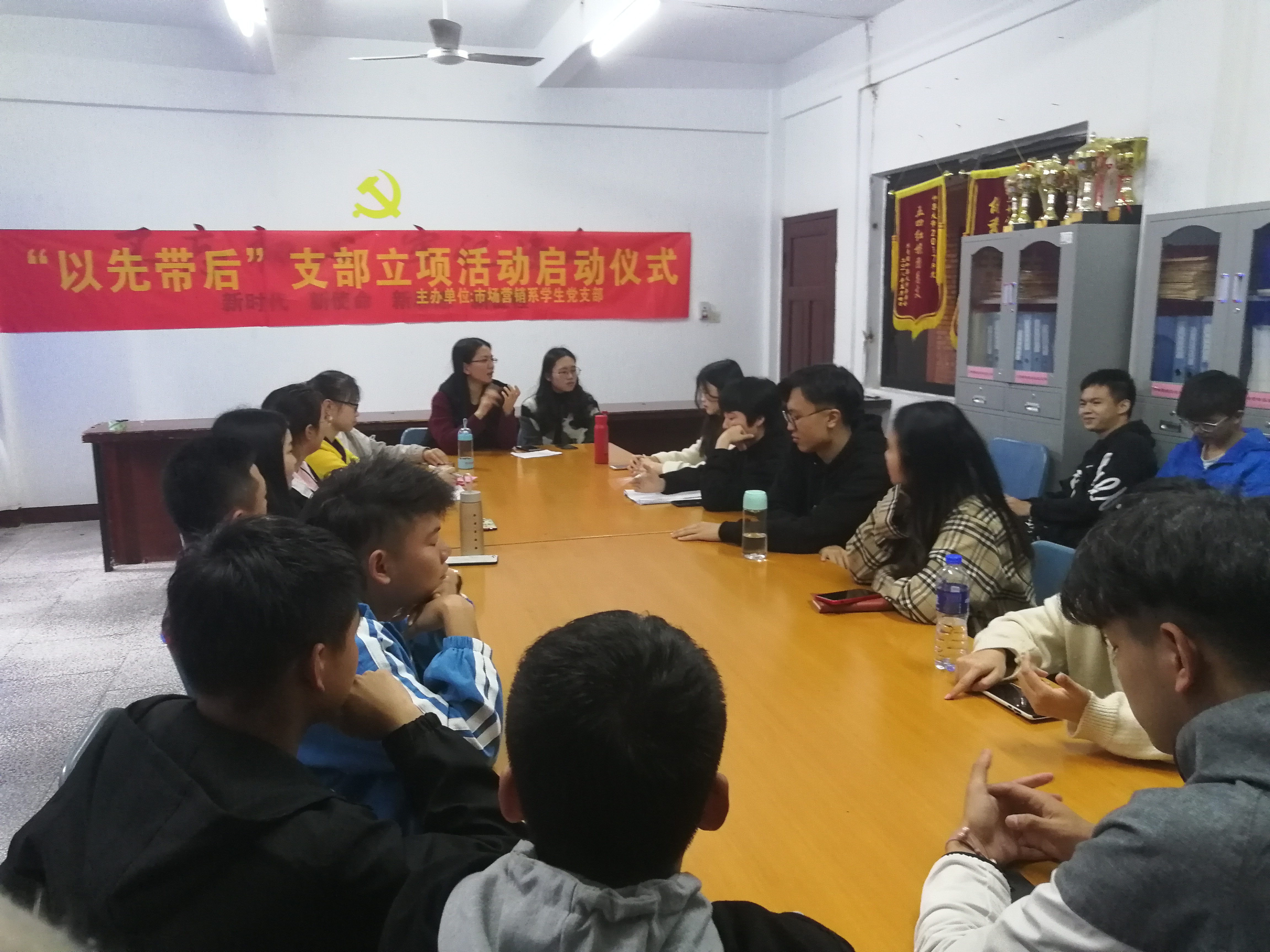 4月1日下午,市场营销系学生党支部在曼谷楼202开展2019年支部立项“以先带后”活动启动会议,参加启动仪式的有市场营销系学生党支部书记连景霞、市场营销系辅导员李育瑜、支部全体学生党员以及2017级和2018级成绩薄弱的同学。