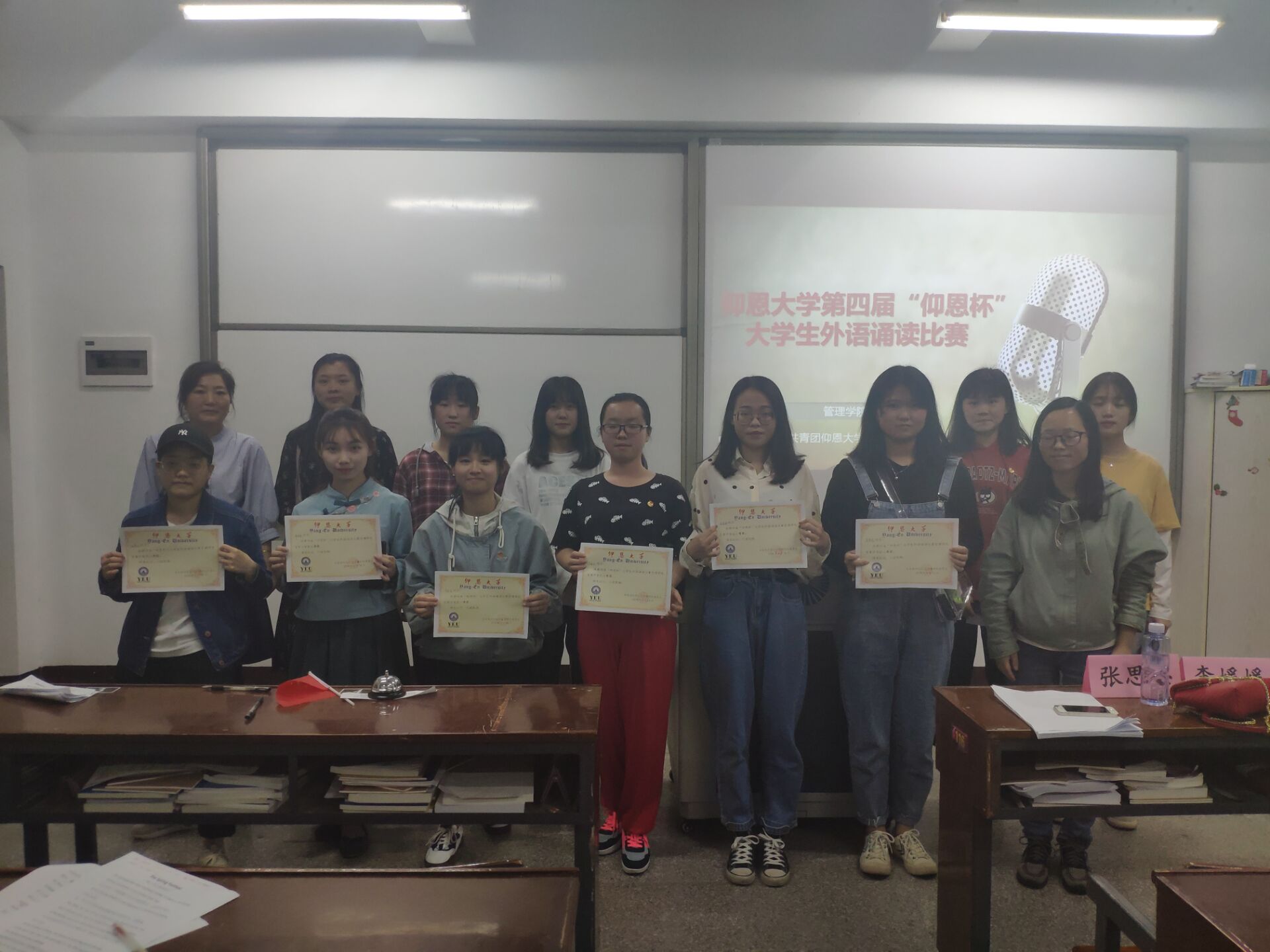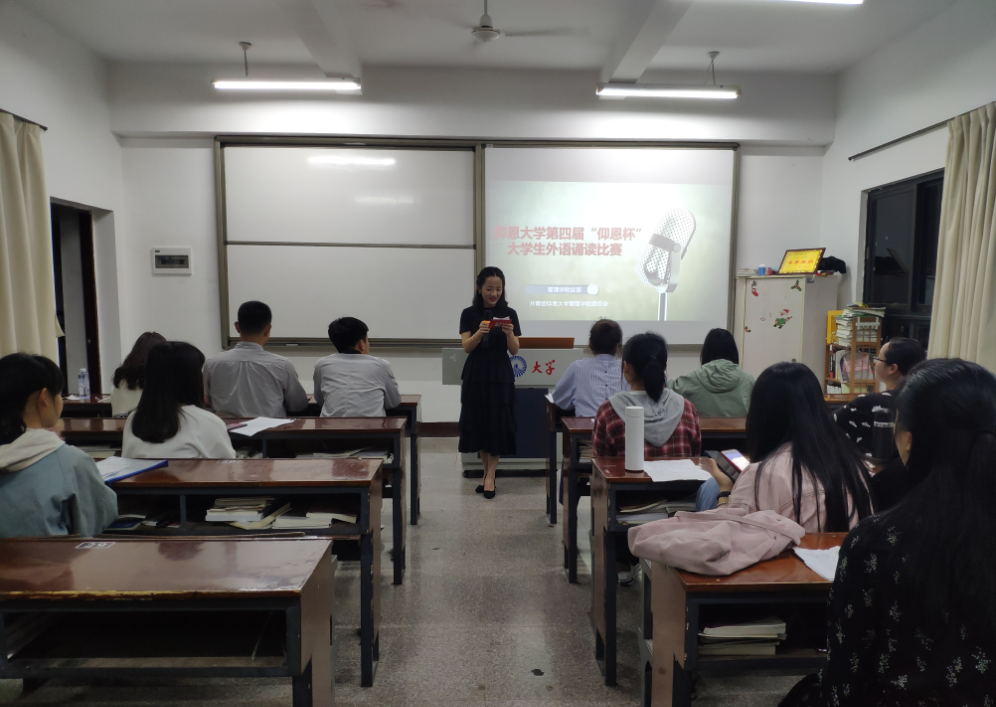 4月18日晚,第四届“仰恩杯”大学生外语诵读比赛太阳成tyc7111cc官网复赛在第一教学区共和楼323举行。复赛由太阳成官网团委主办,各系团总支协办,本次比赛邀请了外国语学院的张思思老师和李媛媛老师担任评委。