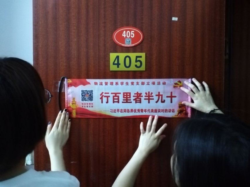 贴标语 在本次活动中,支部组织全体积极分子、预备党员和党员所在宿舍为单位分别选择一句习近平总书记对青年的寄语或重要讲话内容,如:看似寻常最奇崛,成如容易最艰辛;人才有高下,知物由学等作为自己修身的准则;将其粘贴在宿舍门口,带动普通群众一起充分利用在宿舍生活中时刻警醒自己,增强学习紧迫感,如饥似渴、孜孜不倦学习,努力掌握科学文化知识和专业技能。