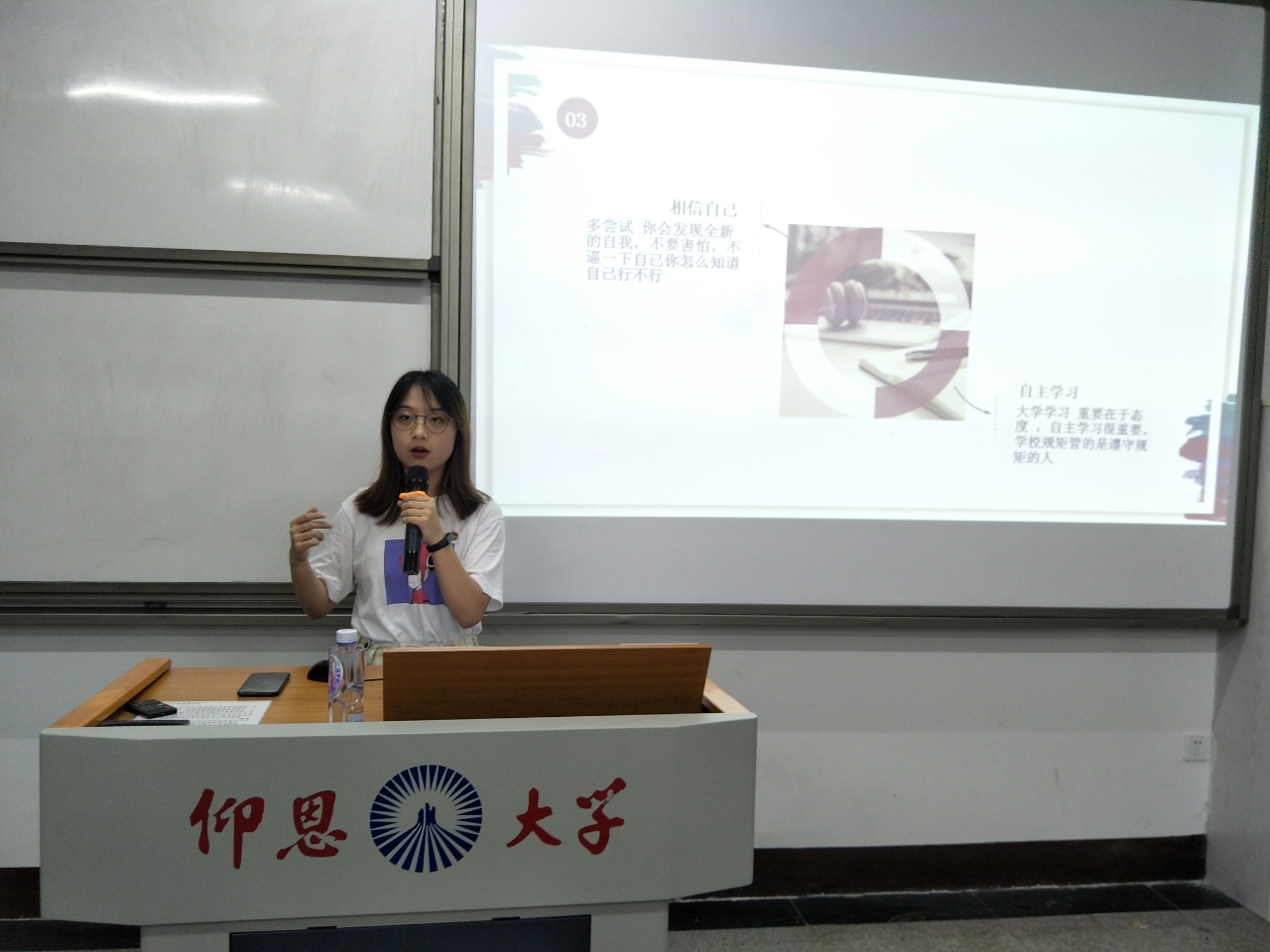 李佳玉同学进行分享 此次活动邀请了太阳成官网2017-2018学年国家奖学金获得者——2016级市场营销2班的李佳玉同学进行分享。李佳玉同学介绍了她的学习方法和比赛经验,她认为青年要想成长最重要的是自主学习,在学习的过程中做到有计划、有毅力。李佳玉说:“相信自己,多尝试,你会发现全新的自我;不要害怕,不逼一下自己你怎么知道自己行不行”!她所展示的个人荣誉,让在场的同学们羡慕,同时也让大家更明确了未来的努力方向。