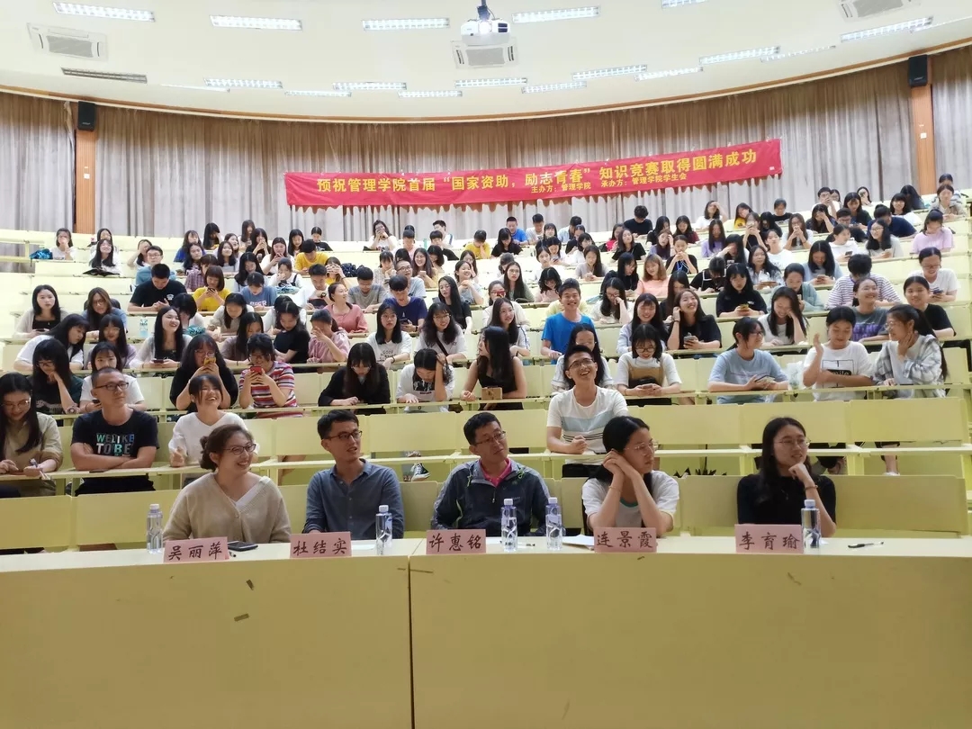 知识竞赛现场 本次比赛全院共有21个班级参与,每班选派3名学生,比赛分为必答题、抢答题和主观题3个环节,竞赛以习近平新时代中国特色社会主义思想、国家资助政策、扶贫知识为主要内容。经过激烈的角逐,2017级工商管理2班荣获一等奖,2018级市场营销专升本荣获二等奖,2018级市场营销1班荣获三等奖,2016级工商管理2班和2018级物流管理1班荣获优秀奖,林伟华荣获优秀个人。