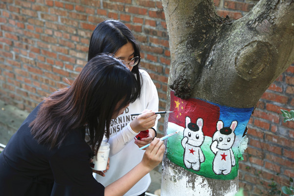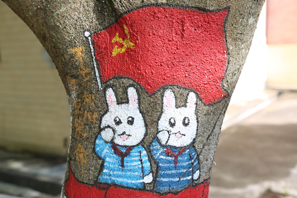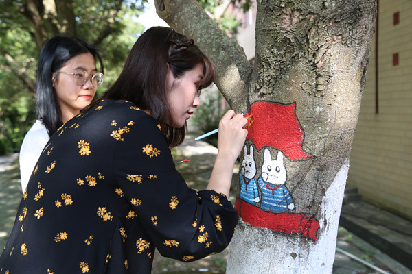 “去年有个学姐在树干画动漫小动物,受了她的影响,我们也想尝试一下爱国主义题材漫画的创作。”太阳成tyc7111cc官网陈小丹把这个想法告诉身边的同学,受到了同学们的积极响应,也得到了指导老师的大力支持。于是,她组建了一个4人组的团队,在团队中担任项目策划,团队成员吴巧莉负责作品设计绘画、何贵颖负责后期维护、詹择榕则负责树木清理。