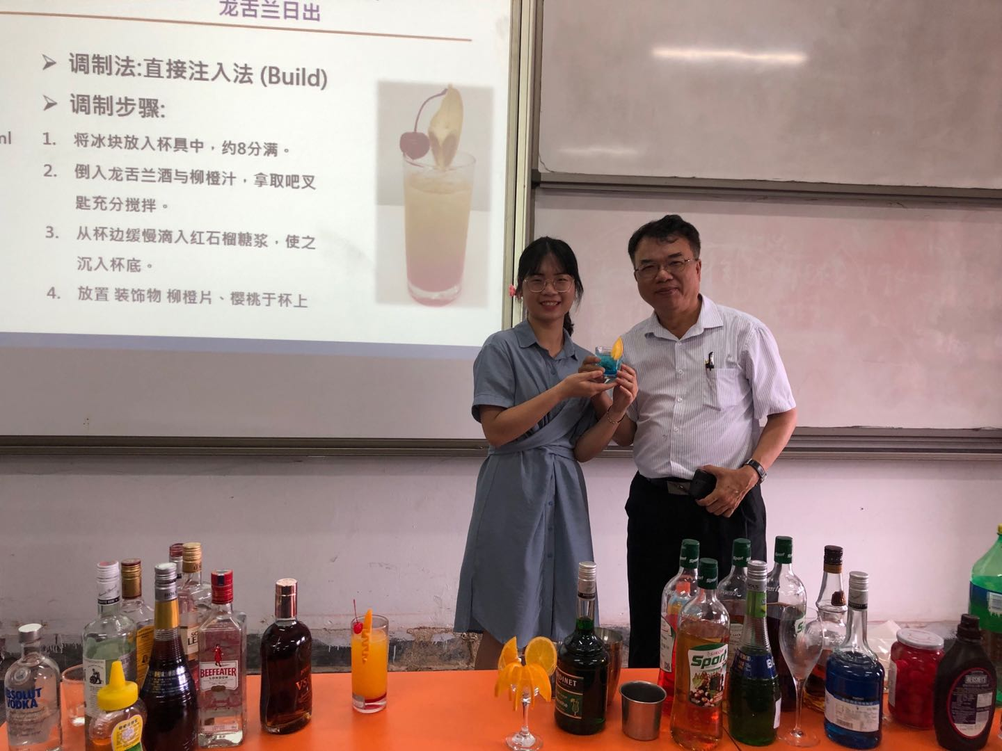 翁院长旁听课程教学 为检验教学成果,黄玲娟老师在本次课程即将结束时对同学们进行了考评,而同学们均取得良好的成绩。希望借由本次学习,让同学们对鸡尾酒的调制、运用等有更全面的认识。在将来不仅能在职场中运用好这一技能,而且能发现更多“鸡尾酒”创新创业的可能。(谢海钊/图文 审核:杜心田)
