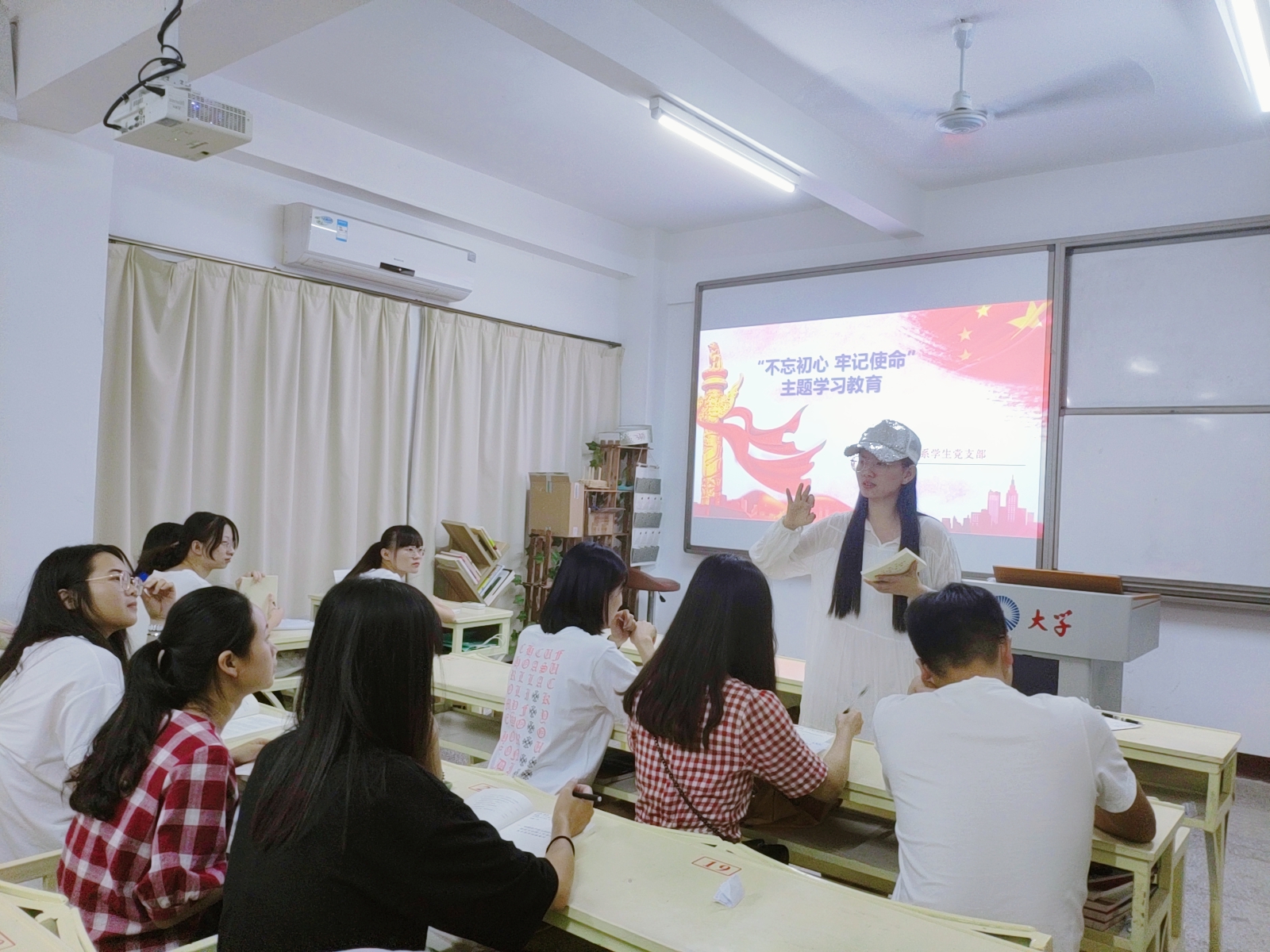 连景霞作动员讲话 会上,连景霞老师作了“不忘初心,牢记使命”主题教育工作计划报告,并向全体党员具体阐述“七个一”的工作内容和要求。同时,她也强调了主题教育的意义,作为新时代的大学生党员,更应该通过自己的实际行动去爱国爱党,为身边的师生服务。