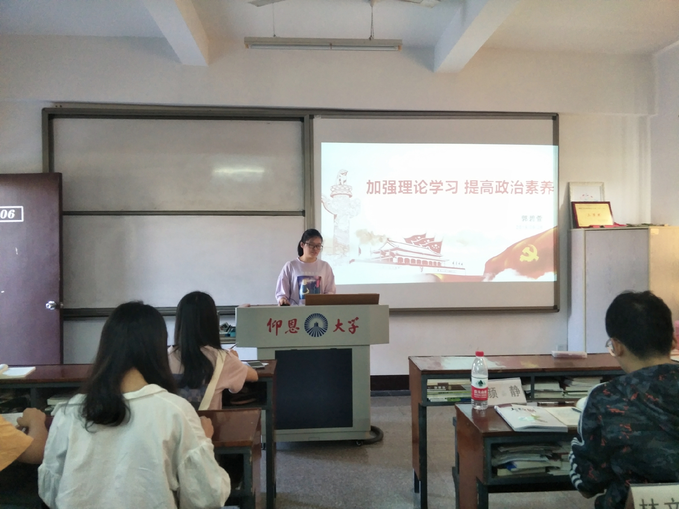 党员学生主讲 会上,主讲人杨冬玉、郭碧萱等两位同志用精美的PPT、生动的语言和饱满的精神,围绕“加强理论学习,提高政治修养”方面的内容进行讲解,使在场党员认识到在学习理论的过程中,一定要紧密结合思想和工作实际,坚持把进一步提高学习本领放在首位,紧跟新时代中国特色社会主义理论的创新内容,切实加强马克思主义理论修养,用党的创新理论武装自己,真正实现用习近平新时代中国特色社会主义思想武装头脑、指导实践、推动工作。