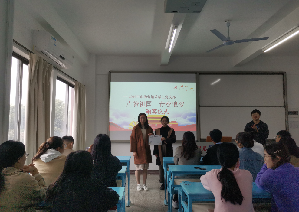 12月19日下午,市场营销系学生党支部在吉龙楼205开展“点赞祖国,青春追梦”征文比赛颁奖活动,支部全体成员到场参加,活动由刘振涛同志主持。