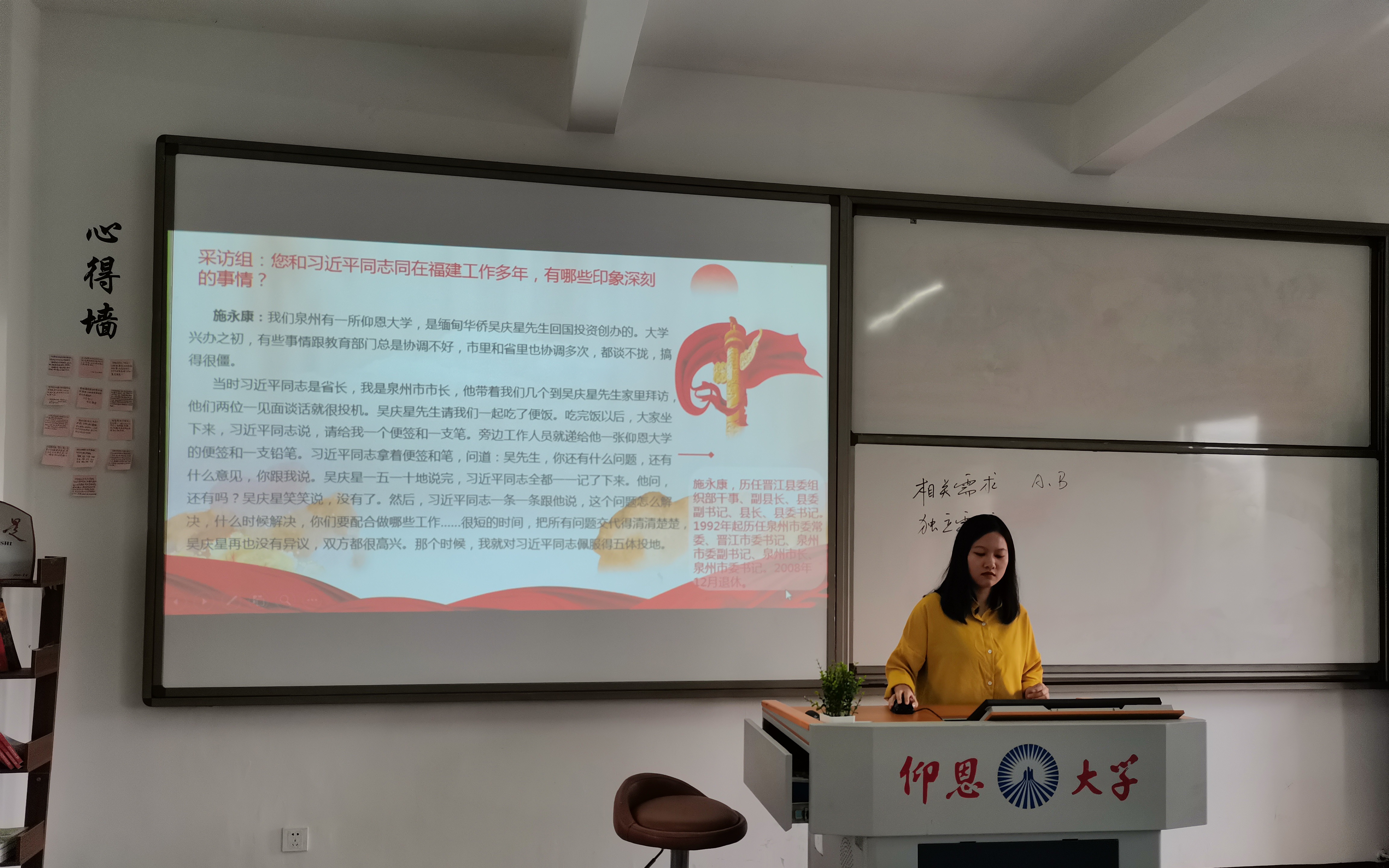 做求真务实的践行者 蔡鸿婷同志以“向总书记学习,做求真务实的践行者”为题,为支部同志们分享了晋江经验。作为一名大学生,要深入学习贯彻总书记的工作态度及讲话精神,以实际行动努力做好本职工作,在日常生活中尊师敬友,向他人谦虚学习。相信在习近平总书记的领导下,国家会越来越繁荣富强,中华民族的伟大复兴一定会实现。