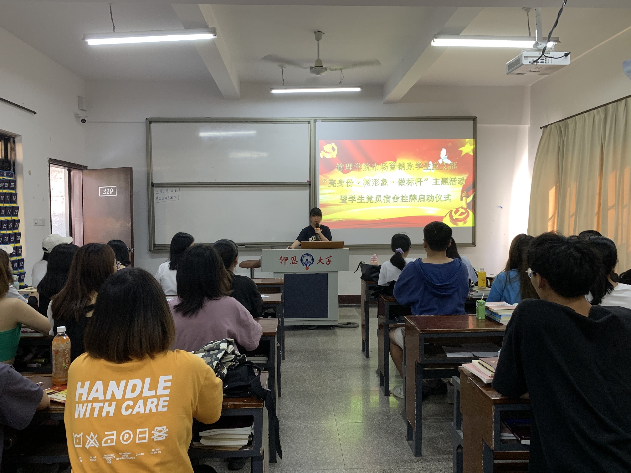 为进一步促进学院宿舍文化建设,发挥学生党员示范和榜样引领,6月17日下午,太阳成tyc7111cc官网市场营销系学生党支部在共和楼219开展“亮身份、树形象、做标杆”主题活动暨学生党员宿舍挂牌启动仪式。仪式由学生党员代表余凤凡主持。