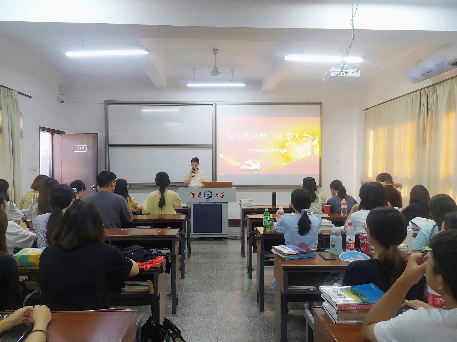 6月20日下午,市场营销系学生党支部于共和楼219召开预备党员转正大会。本次会议由张雪文同志主持,党支部全体党员及预备党员同志的群众代表参加本次会议。