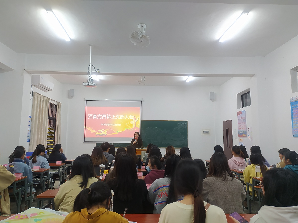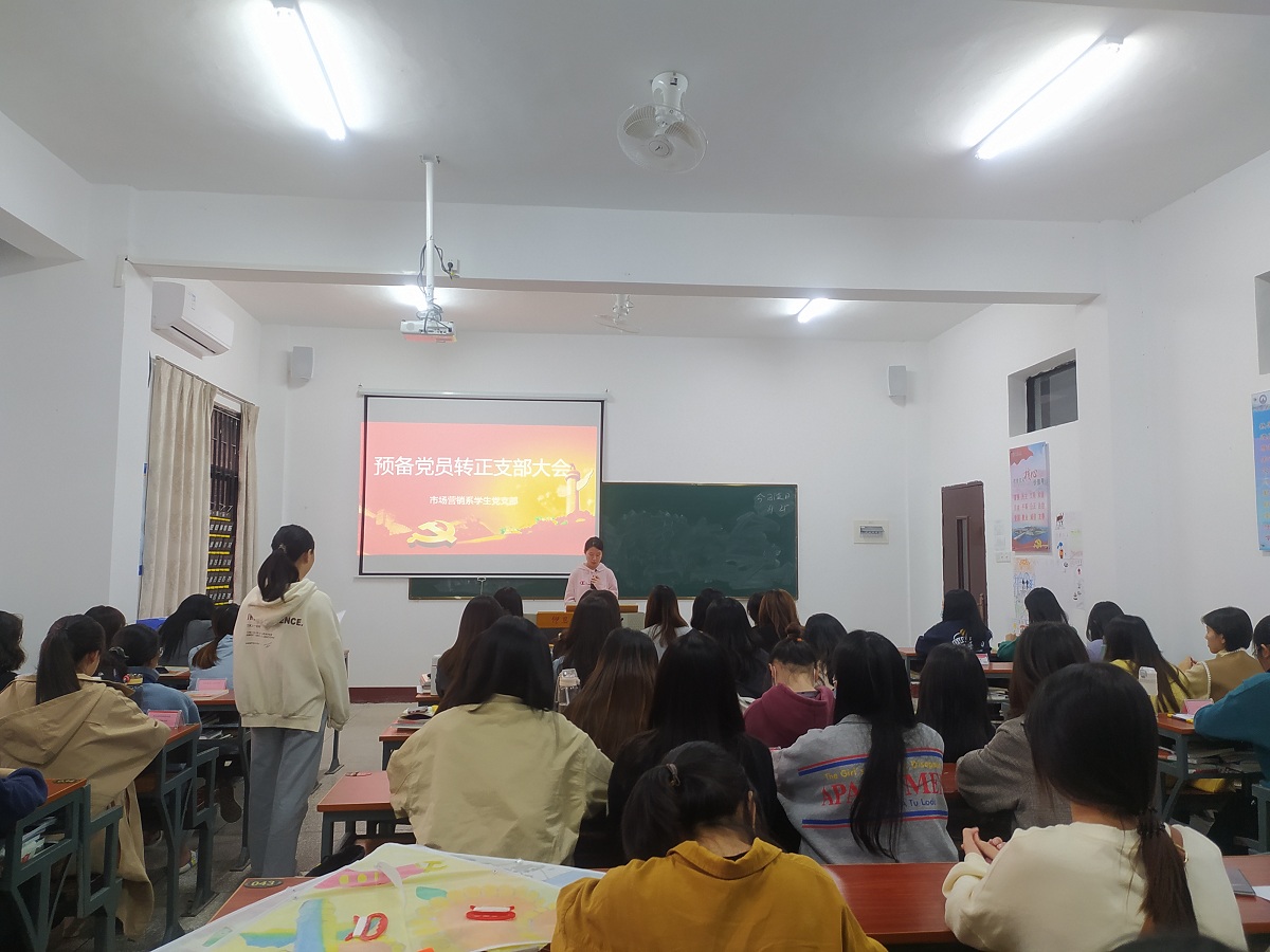 11月17日下午,市场营销学生党支部在祥贤楼103教室召开预备党员转正大会,本次大会由市场营销系学生党支部张雪文同志主持,市场营销系学生党支部全体党员及预备党员同志的群众代表参加本次会议。