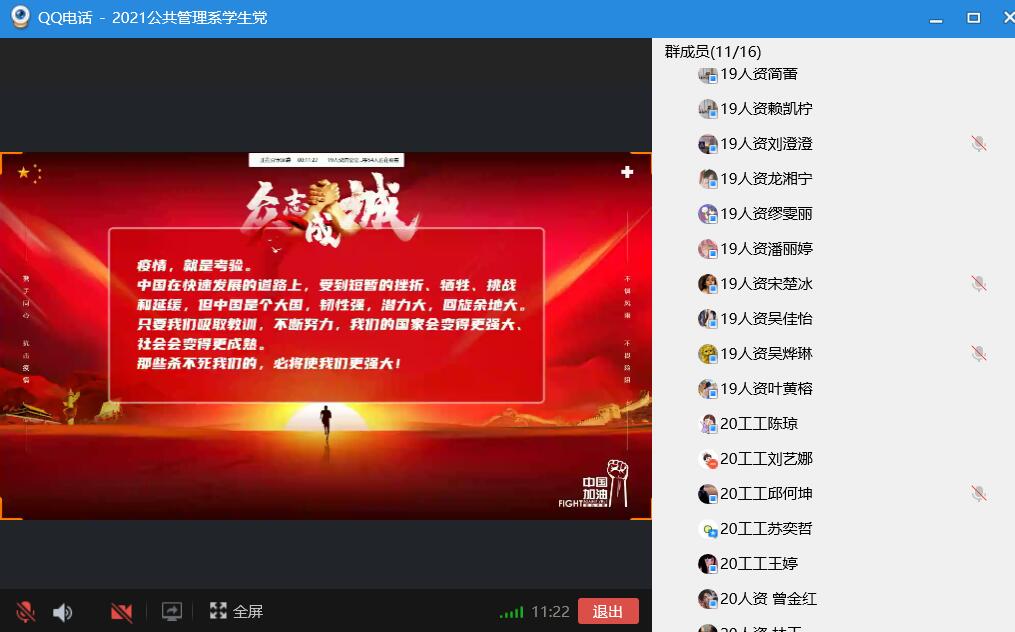 施佩如同志分享疫情中感人故事 本次线上活动是由施佩如同志进行题为“众志成城抗击新冠疫情”的分享,她向我们讲述当前泉州疫情的缘起和数据,还同我们分享在防疫行动中做出贡献的典型人物及涌现出来的感人事迹。在线下,支部通过让大家观看《战”疫“24小时》纪录片,使全体支部成员明白疫情不仅仅考验的是我们国家的综合国力和社会管理能力,更是每个国人的素质。即便是特殊时期,大家也要积极参与学校和学院的防疫工作,在疫情防控工作中发挥模范带头作用。