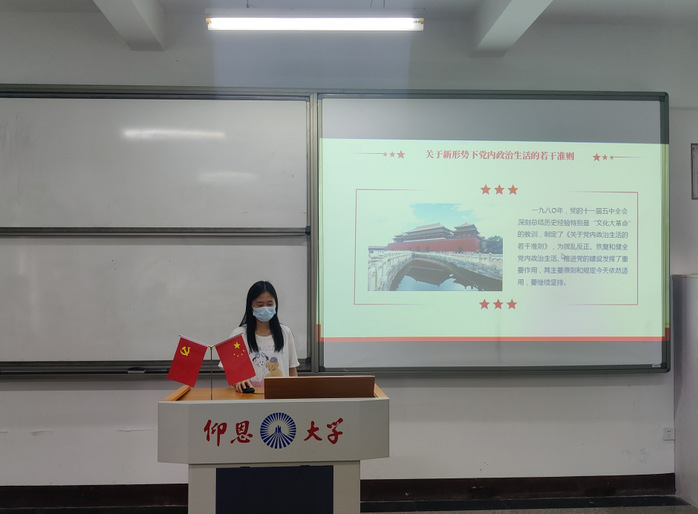 本次活动由郑丽颖同志主持召开。首先,郑丽颖同志介绍了本次会议的主要内容和相关流程;然后带领大家齐唱国歌并重温了入党誓词。在会上,支部成员集中学习了《关于学习新形势下党内政治生活的若干准则》。支部书记岳明在会上强调,新形势下加强和规范党内政治生活,必须以党章为根本遵循,在日常工作中必须坚持党的政治路线、思想路线、组织路线、群众路线,着力增强党内政治生活的政治性、时代性、原则性、战斗性,着力增强党的自我净化、自我完善、自我革新、自我提高。