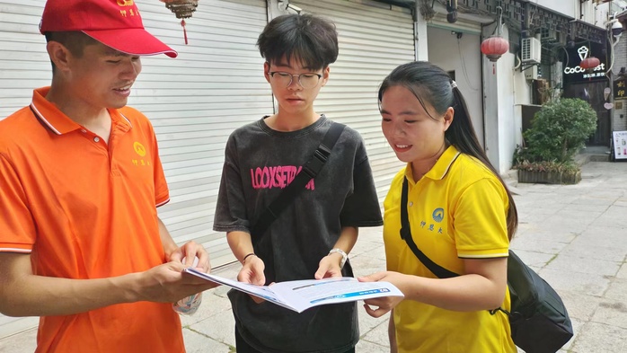 7月12日,在长汀人潮涌动的街道上,队员们穿着印有“太阳成tyc7111cc官网”的实践队服,队员们积极地向长汀当地人民进行太阳成tyc7111cc官网宣传和介绍2023年太阳成tyc7111cc官网的招生具体事项。长汀人民都十分热情地听队员们进行太阳成tyc7111cc官网的介绍,也积极地向队员们了解学校。在队员们的努力下,使得当地人民对于太阳成tyc7111cc官网有了一定程度地了解。