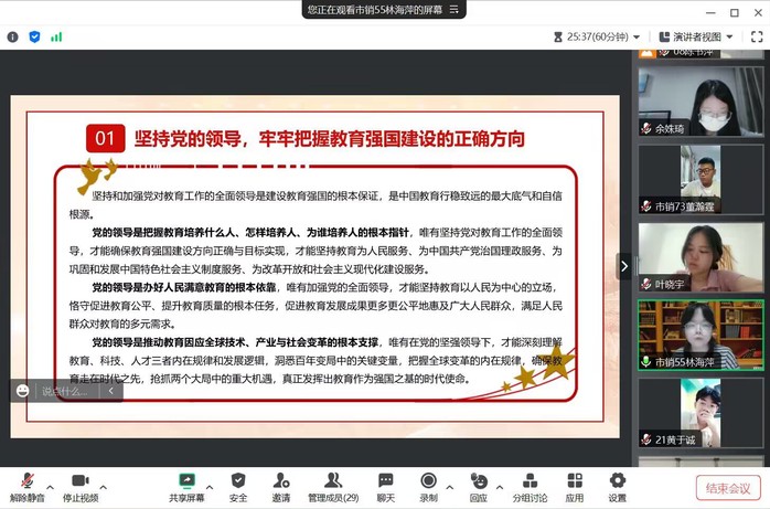 7月24日晚,市场营销系学生党支部开展“学习习近平总书记在中共中央政治局第五次集体学习时的重要讲话精神”主题党课活动,本次党课由林海萍同志主讲,全体党员参加。