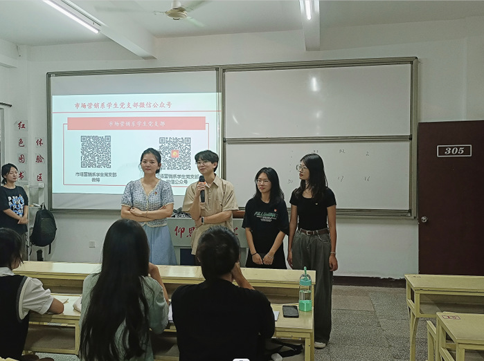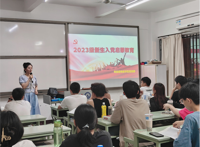 9月21日晚,市场营销系学生党支部在支部书记连景霞老师的带领下,前往5个2023级新生班级举行入党启蒙教育,全体党员参加。