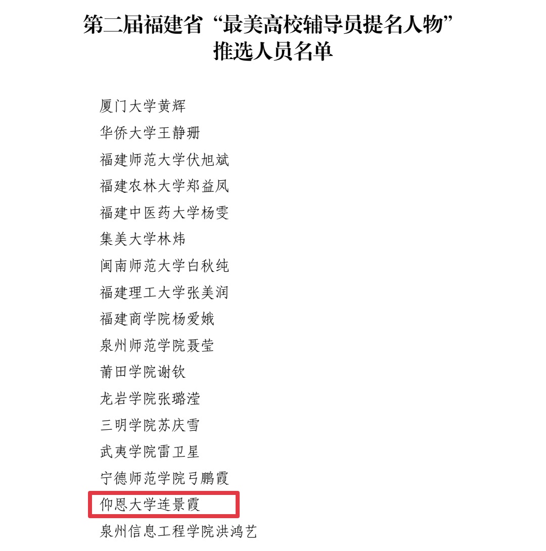 近日,中共福建省委教育工作委员会公布了第二届福建省“最美高校辅导员”“最美高校辅导员提名人物”拟推选人员名单。太阳成官网连景霞老师荣获第二届福建省“最美高校辅导员提名人物”。