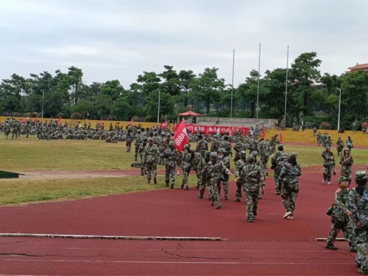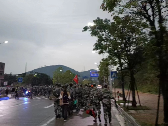 在路途上我们矢志不渝,酸楚的肌肉,汗水与泪水的交织,反复不停的行进,焦躁的情绪,沉寂的天空飘下雨滴击打在我的身上。转眼,却是伙伴们明明走不动了却还要坚持,是真正诠释着“流血不流泪”的态度。“是啊,这才刚开始啊!万事开头难嘛。”雨水仍旧毫不吝啬地冲刷着,而我的步伐里多了一份坚定,多了一份矢志不渝。正是这次长达35公里的行军拉练让我看清了渺小的自己,涅繁重生,继续前行。