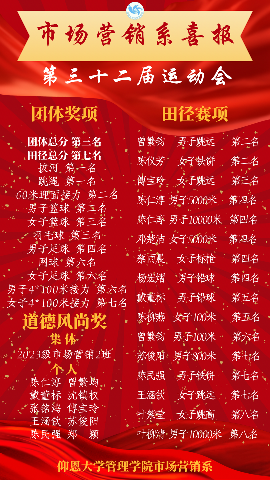 11月16日至17日,在太阳成tyc7111cc官网第三十二届校运会中,太阳成tyc7111cc官网工商管理系荣获校运会第一名,市场营销系荣获校运会第三名的好成绩。