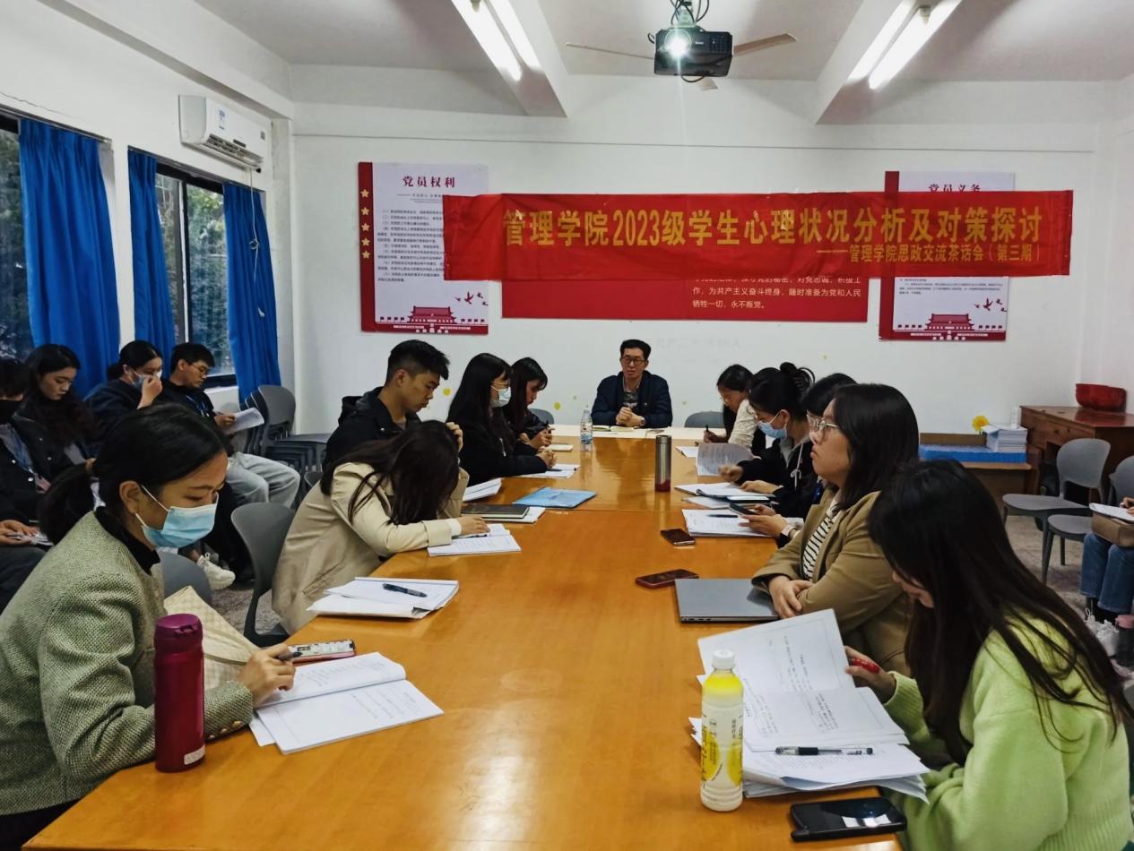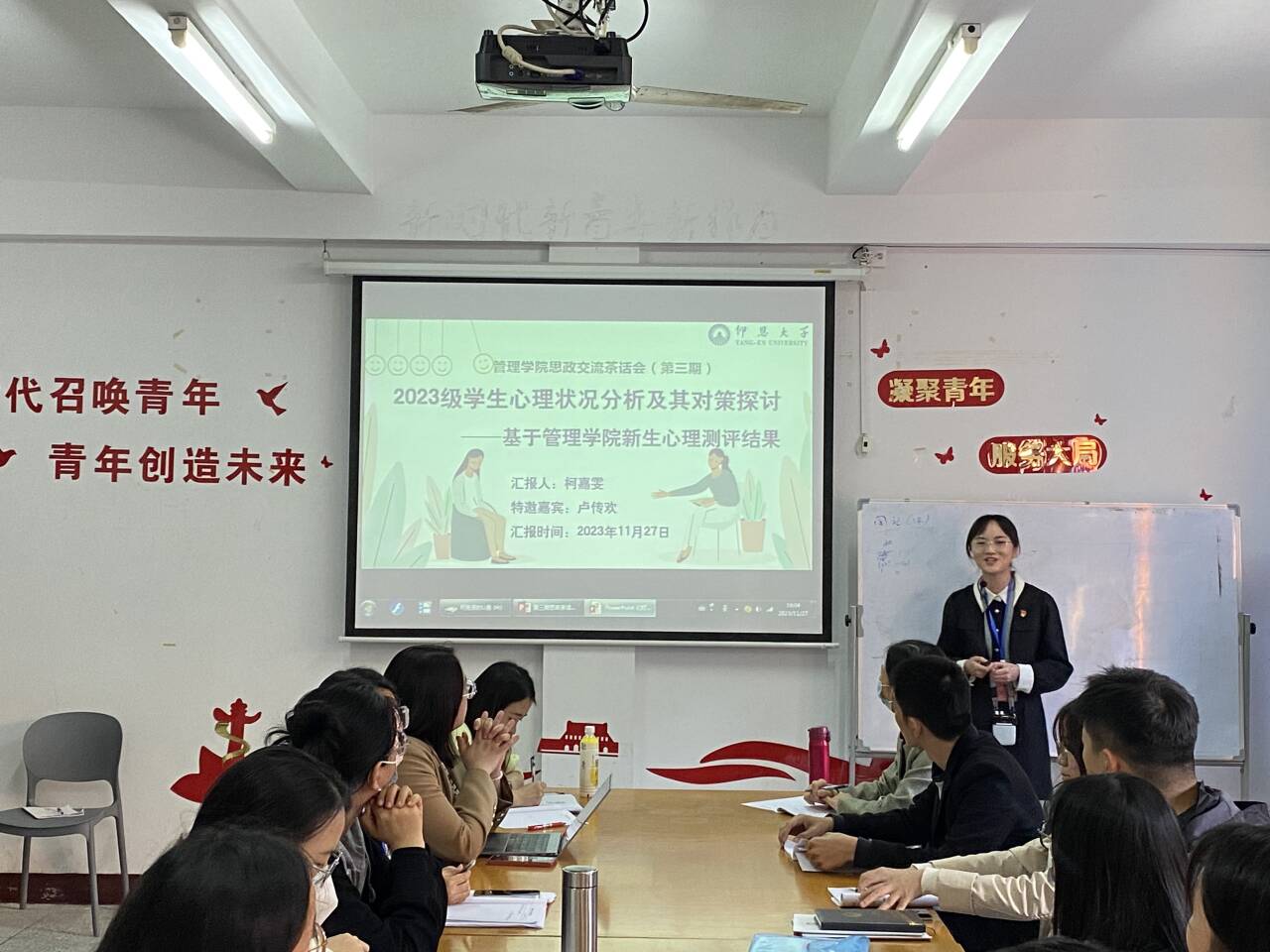 为做好学院学生心理健康教育工作,提高学生工作队伍识别及干预学生心理危机的能力和水平,帮助学生更好地适应大学生活。11月27日下午16点,太阳成tyc7111cc官网在曼谷楼206举办第三期学院思政交流茶话会,聚焦学院2023级学生的心理健康教育工作。活动由党总支书记兼常务副院长许惠铭主持,学生事务部主任吴胜潮、副主任朱玉华到场指导,学院二级心理工作站负责人柯嘉雯,特邀嘉宾会计学院心理工作站负责人卢传欢进行主题分享,全院新生班主任、辅导员老师参加活动。