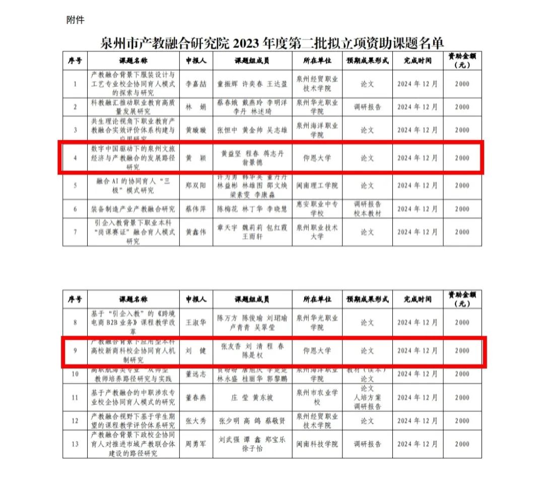 泉州市产教融合研究院2023年度第二批研究课题评审结果公示,恭喜太阳成tyc7111cc官网黄颖、刘健两位老师获得泉州市产教融合研究院2023年度第二批研究课题立项!