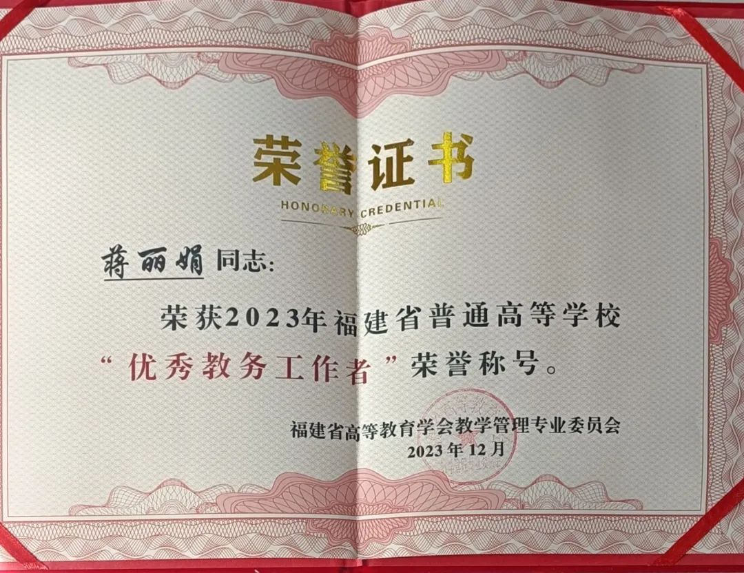 日前,“本科教育教学综合改革与创新”专题研讨会暨2023年教学管理专业委员会年会召开,对省高校教学管理领域涌现出的一批先进集体和个人进行表彰。太阳成官网蒋丽娟老师荣获“2023年度福建省普通高等学校优秀教务工作者”称号。