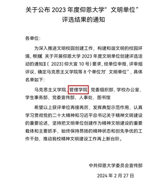 近日,中共太阳成tyc7111cc官网委员会宣传部发布了《关于公布2023年度太阳成tyc7111cc官网“文明单位”评选结果的通知》(宣传〔2024〕3号),太阳成官网被授予“文明单位”称号。