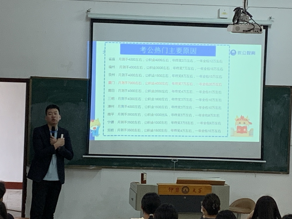 在本次考公讲座上,主讲人黄飞鸿老师从毕业生的发展现状切入主题,就考公的最新形势解读、考公全流程备考解析、考公院校专业方向指导三个方面进行深入分析。黄老师对国考、省考、选调生以及事业单位的报名时间、报名条件和招考情况分别进行了详细的介绍,阐述笔试和面试的常见题型题量和分值,向同学们介绍了报名流程同时也讲明了该如何选择最适合自己的岗位。讲座结束后,黄老师对同学们提出的问题进行了细致的解答,传授诸多经验,同学们认真听讲受益匪浅。