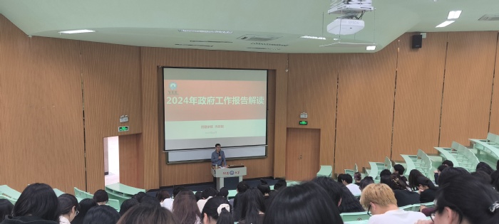 讲座中,许院长指出2024年是中华人民共和国成立75周年,是实现十四五规划目标任务的关键的一年,并对我国发展面临的机遇和挑战进行综合分析,深刻对今年经济社会发展的政策取向进行解读,密切结合个人在学校多年来的学习和工作经历,让同学们更好理解当今经济社会发展的趋势和目标。