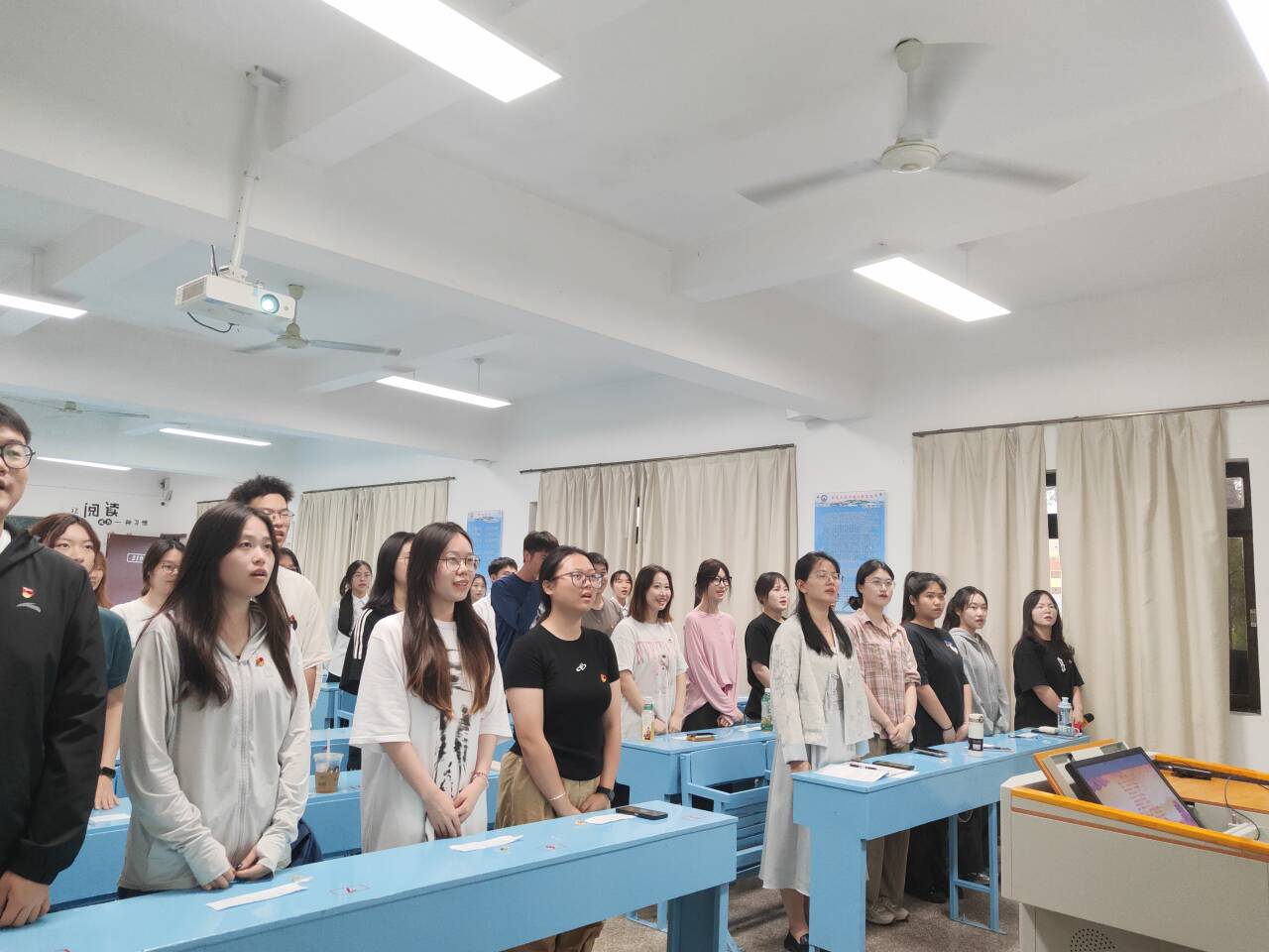 大会的开始,全体起立一齐奏唱《国际歌》。活动中,邓楚洁、曾欣怡等8名发展对象依次从入党动机、凭何入党以及入党后怎么做等方面分别向党组织进行汇报,并表达了自己入党的决心。群众代表分别指出了8名同志在学习、生活、工作等方面的不足,发展对象们虚心接受,并表示将不断审视自我,积极寻求进步,完善自己的能力和品质,努力向优秀党员看齐。大会采取无记名投票方式进行表决,一致同意邓楚洁、曾欣怡等8名同志发展为预备党员。 随后,正式党员为新发展的预备党员佩戴党徽,曾丽莎同志带领全体预备党员庄严宣誓。