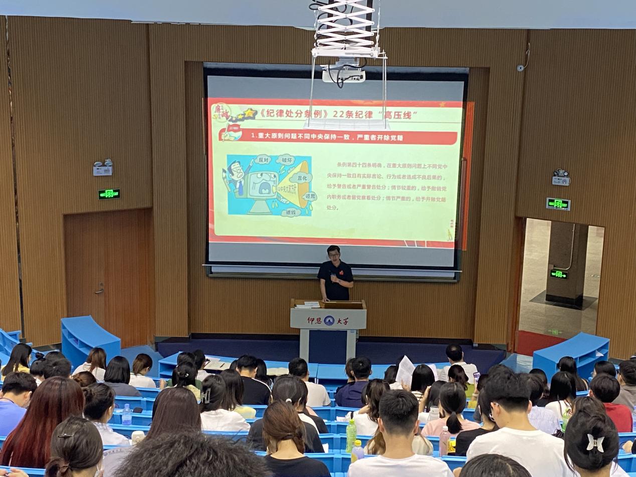 为进一步增强党员的纪律意识,提高党性修养,6月13日下午,太阳成tyc7111cc官网党总支书记许惠铭在和昌教学楼求是大讲堂为全体师生党员开展了一场主题为“《中国共产党纪律处分条例》22条纪律高压线”的专题党课,太阳成tyc7111cc官网全体师生党员参加。
