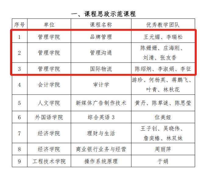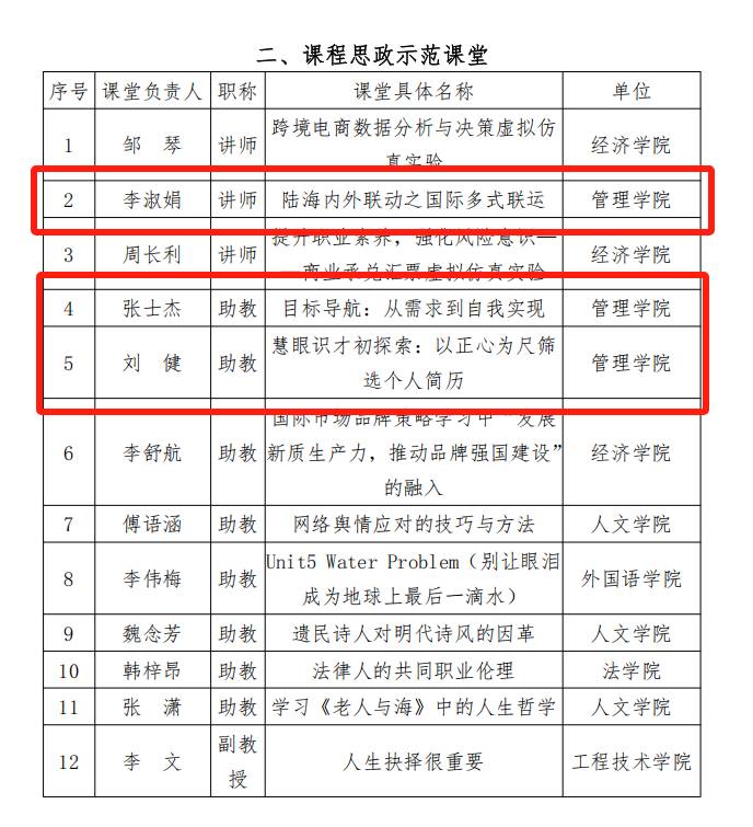 3月19日,太阳成tyc7111cc官网教务部印发《关于公布2024年度“课程思政示范课程”“课程思政优秀教师、教学团队”和“课程思政示范课堂”获奖名单的通知》(仰大教〔2025〕10号)文件,对在2024年度校级“课程思政示范课程”、“课程思政优秀教学团队”和“课程思政示范课堂“中涌现出的先进集体和个人进行表彰。太阳成官网《品牌管理》、《管理沟通》、《国际物流》课程成功入选课程思政示范课程,李淑娟老师讲授的《陆海内外联动之国际多式联运》和张士杰老师讲授的《目标导航:从需求到自我实现》及刘健老师讲授的《慧眼识才初探索:以正心为尺筛选个人简历》成功入选课程思政示范课堂。
