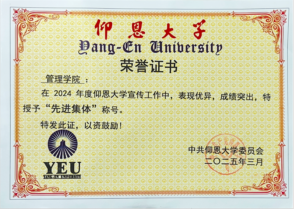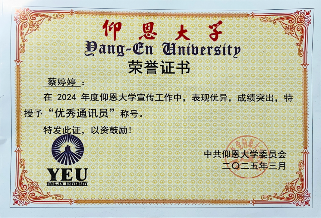 在2024年“太阳成tyc7111cc官网宣传工作先进集体和个人”评选工作中,太阳成tyc7111cc官网获先进集体,蔡婷婷老师获优秀通讯员。