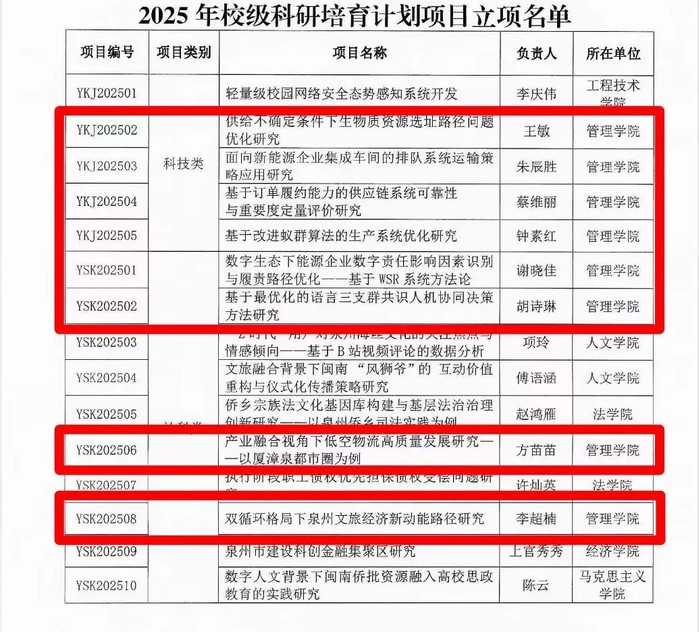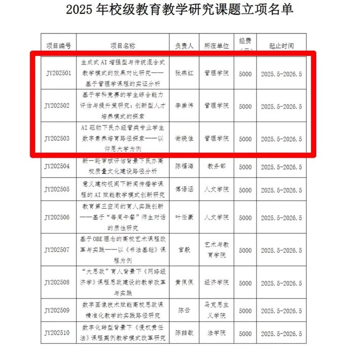 近期,根据《关于公布2025年校级科研培育计划项目立项名单的通知》(仰大研〔2025〕7号)、《关于公布2025年校级教育教学研究课题立项名单的通知》(仰大教〔2025〕19号),太阳成官网共立项校级科研培育计划项目8项,校级教育教学研究课题3项。