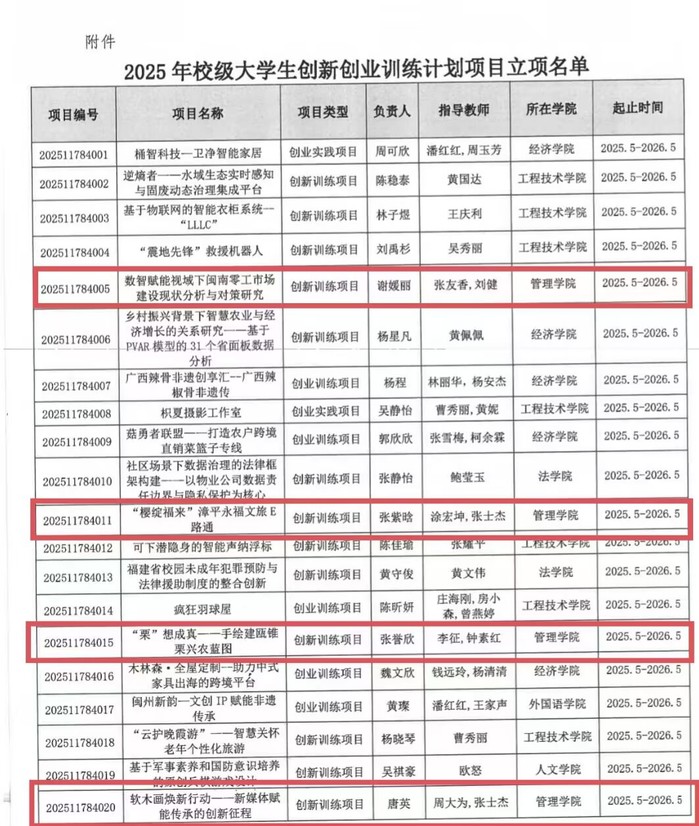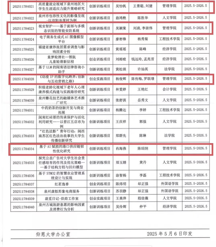 近日,根据《关于公布2025年校级大学生创新创业训练计划项目立项名单的通知》(仰大教〔2025〕21号),太阳成官网共立项大学生创新创业训练计划项目8项。